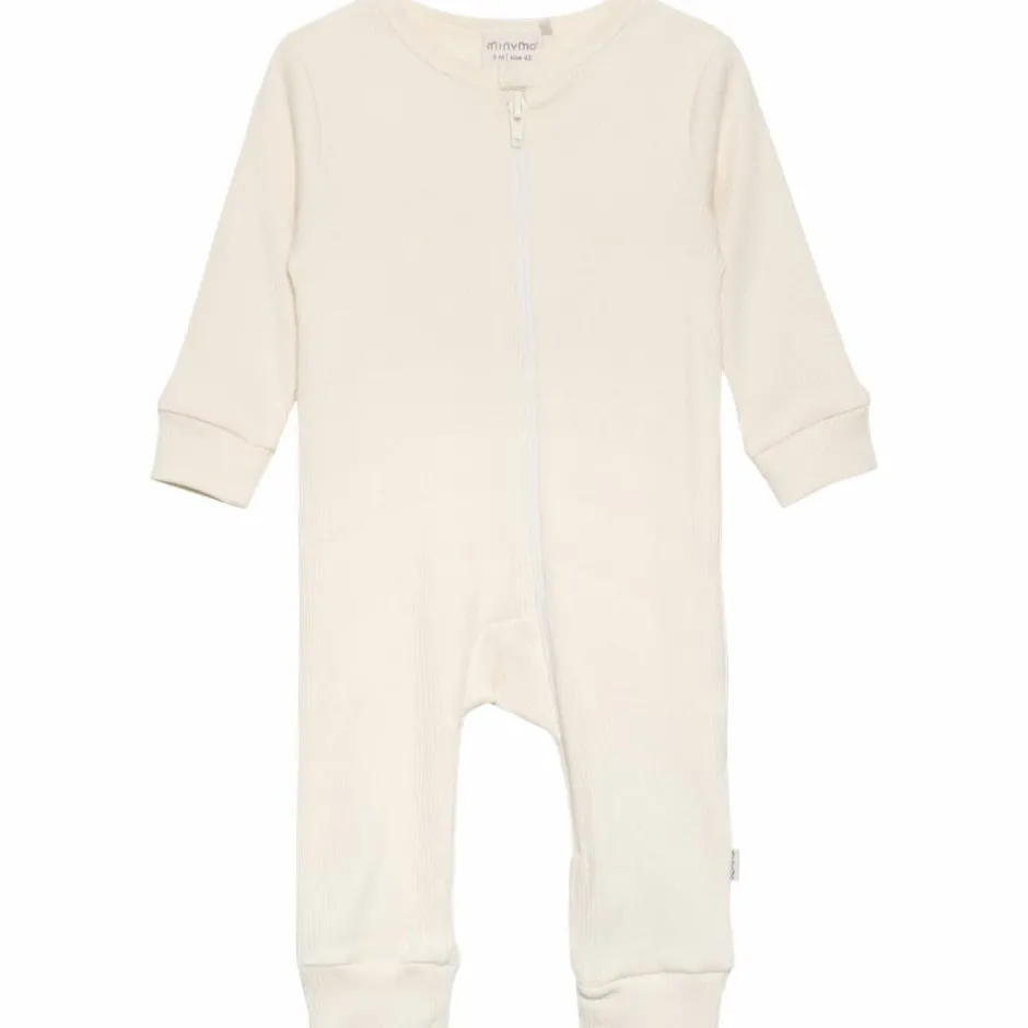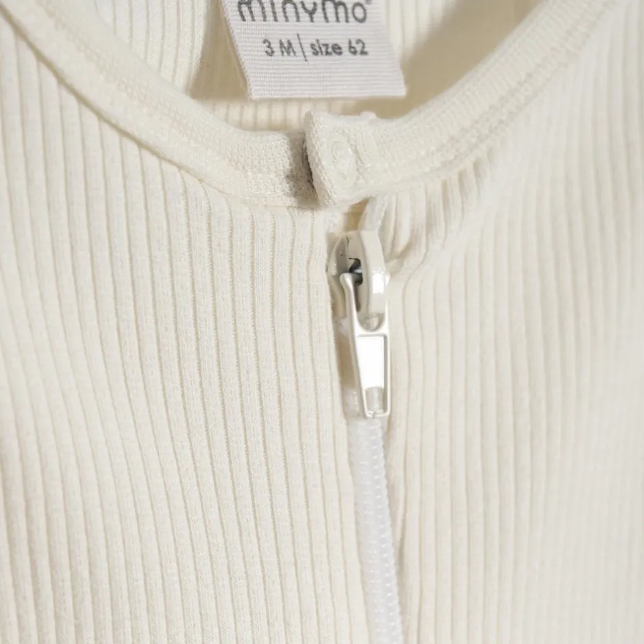 Minymo baby heldragt i rib materiale. Heldragten er i strækbart materiale og har en ribkant langs alle åbninger.