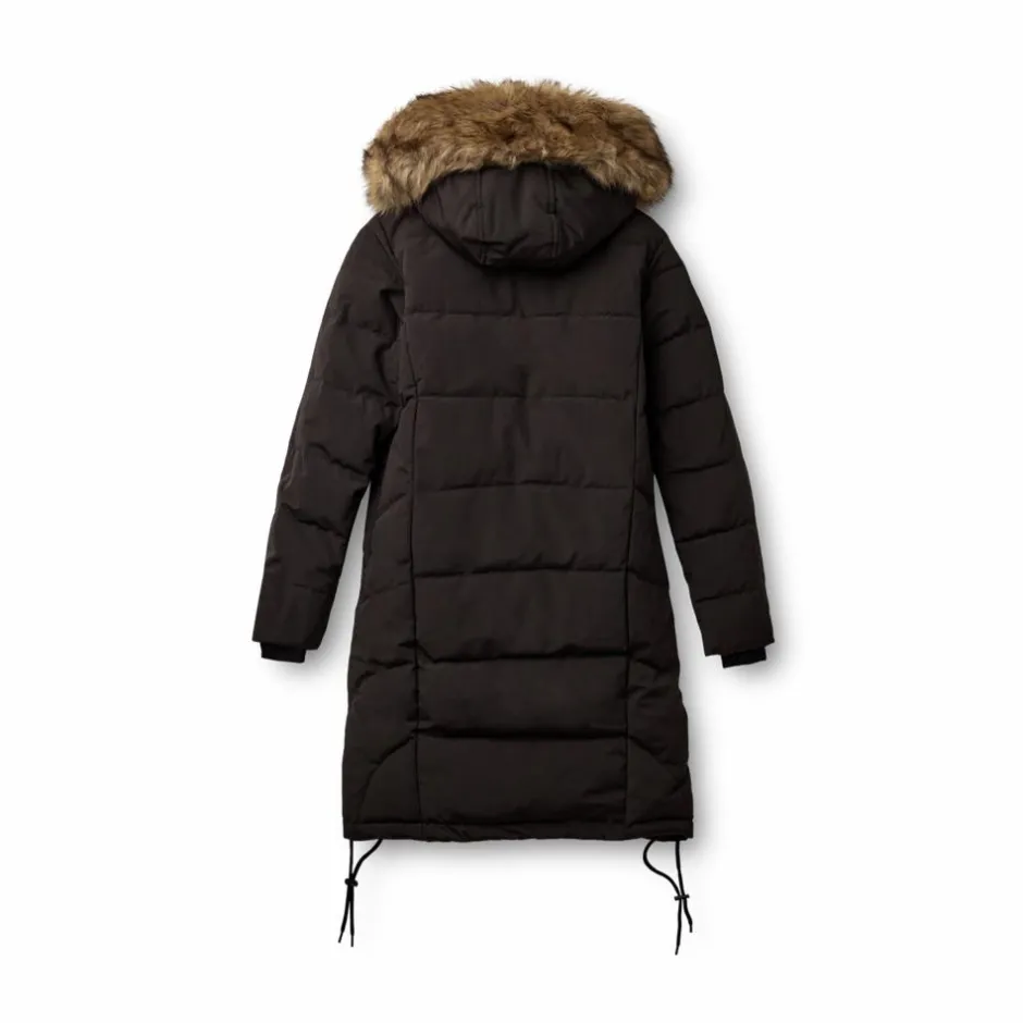 Lang dame vinterjakke med gennemgående knap- og lynlåslukning. Jakken har aftagelig hætte med aftagelig pels samt snøre. Jakken har to lommer med lynlås samt en lomme med lynlås indvendig. Det er muligt at snøre jakken ind i ryggen, så den får en flot pasform og i bunden af jakken. Jakken har varmt plys for indvendig i den øverste del og gemt ribkant i ærmegabet.