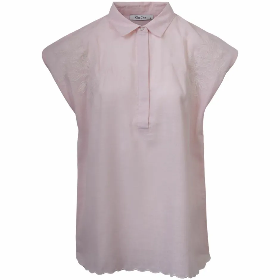 ZbyZ dame +size bluse uden ærmer. Toppen har stolpelukning og krave, samt fine broderede detaljer på fronten og ved taljen.