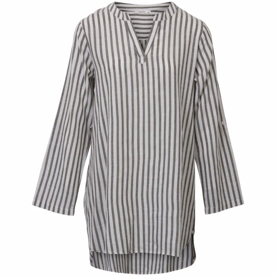 Dame tunika med gennemgående striber. Tunikaen har v-hals og justérbare ærmer.
