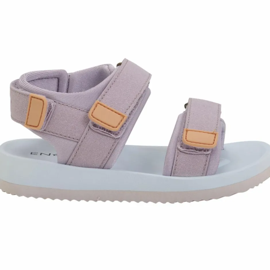 En Fant sandaler med lilla velcrolukninger. Sandalerne har et En Fant logo bagerst og et på sålen. Sandalerne kan spændes ind på bagsiden med en velcrolukning, som sikrer at de sidder godt på foden.