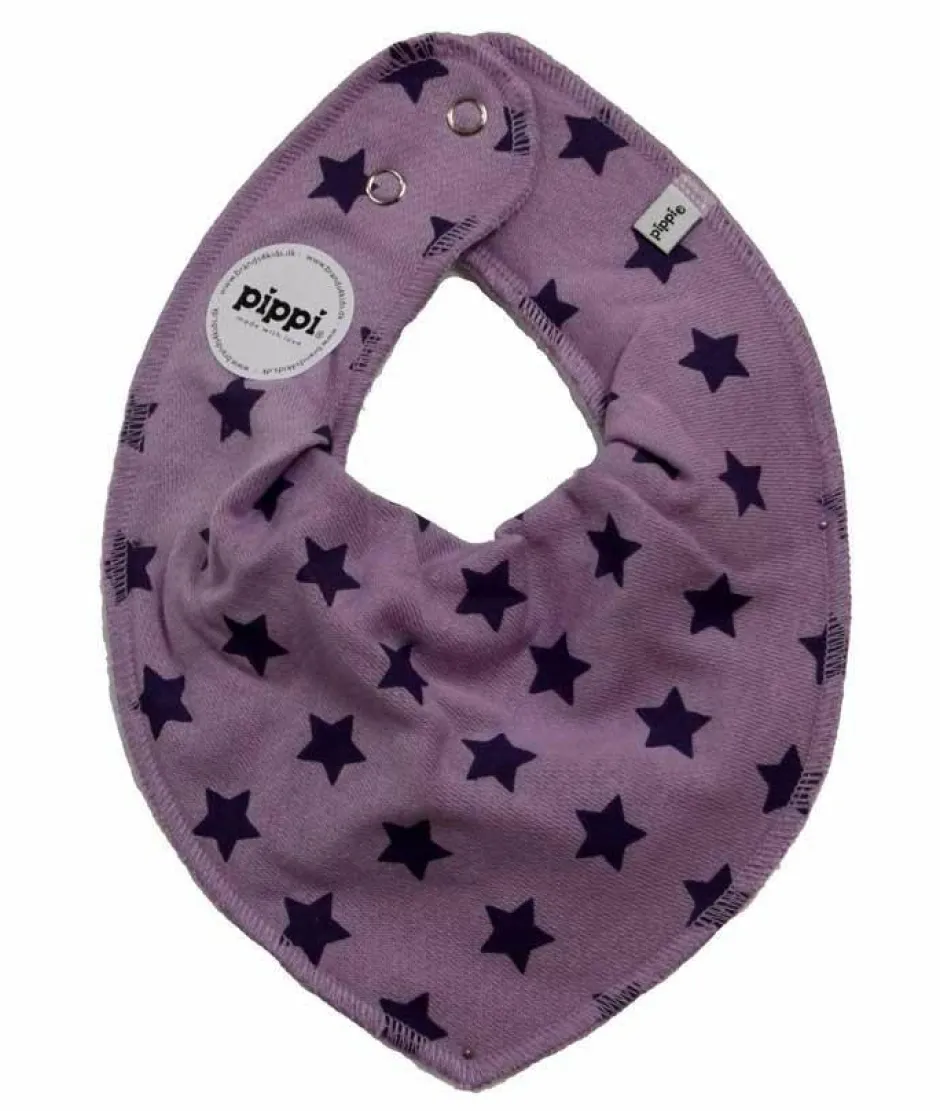 Pippi hagesmæk. Savlesmækken har all-over stjerne print og lukkes i halsen med justérbar knaplukning. Den trekantede hagesmæk er designet som et smart bandana tørklæde. Hagesmække er ganske uundværlige med en baby i huset. Med din fine savlesmæk fra Pippi holdes baby tør uanset om det leger eller spiser.