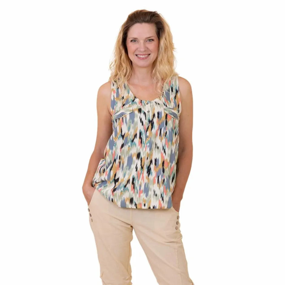 Cha Cha dame top. Smart top med brede stropper. Toppen har pyntelommer på brystet, samt knappelukning ved den runde halsudskæring.