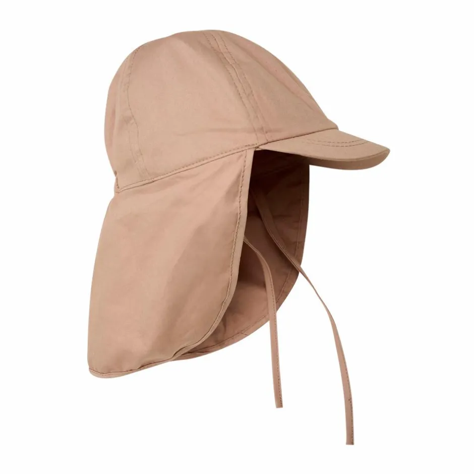 En Fant børne solhat. Smart sommerhue med praktisk kasketskærm og lang skygge bagpå. Elastik på baghovedet og snore under hagen sikrer, at hatten sidder godt på barnets hoved.