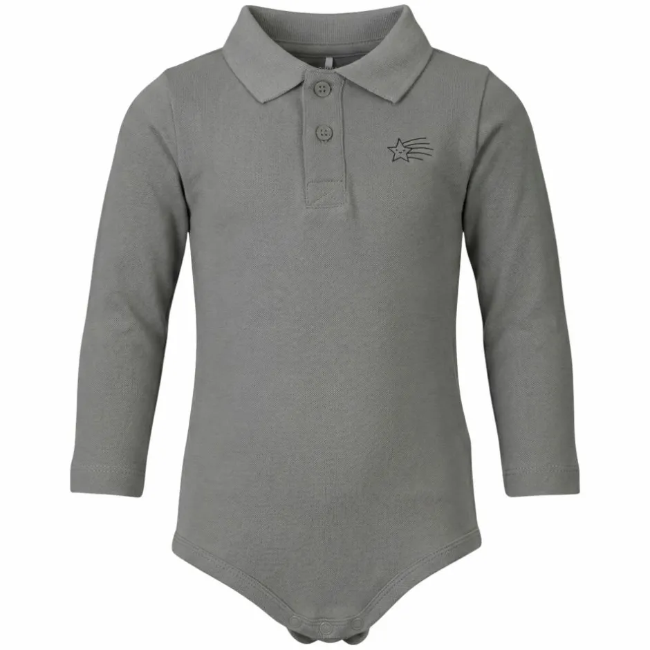 Guppy baby langærmet body med en fint lille print af et stjerneskud. Bodyen er designet med en stilfuld polokrave med stolpelukning med to knapper, samt tre trykknapper mellem benene.