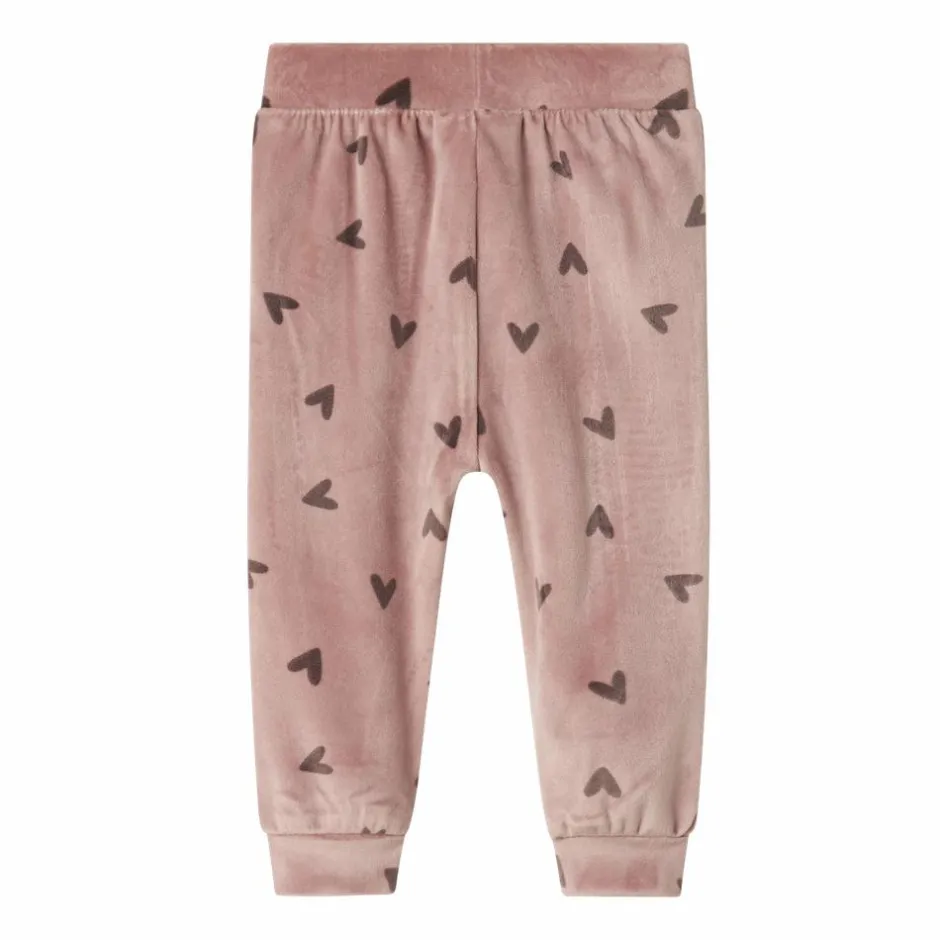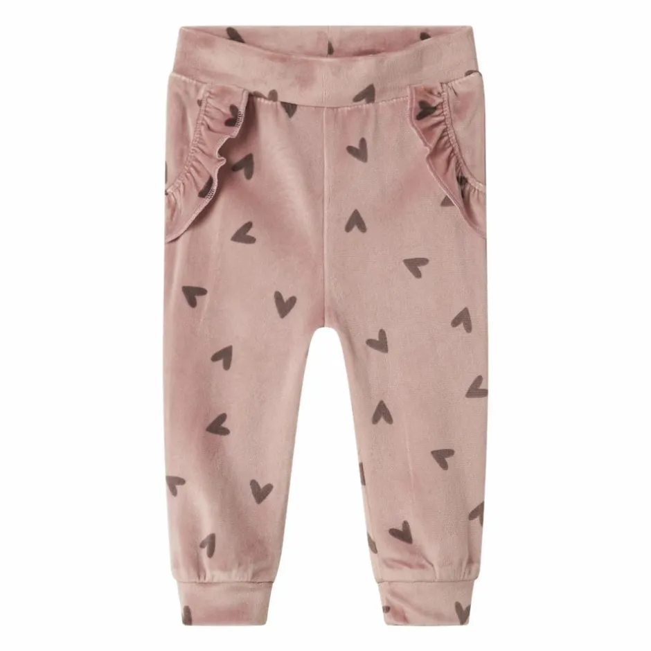 Guppy baby bukser i lækker blød velour. Bukserne har justerbar elastik i taljen og de fineste detaljer som en flæsekant foran i siderne og et sødt all-over print af små hjerter. Perfekt til både hverdag og festlige lejligheder.