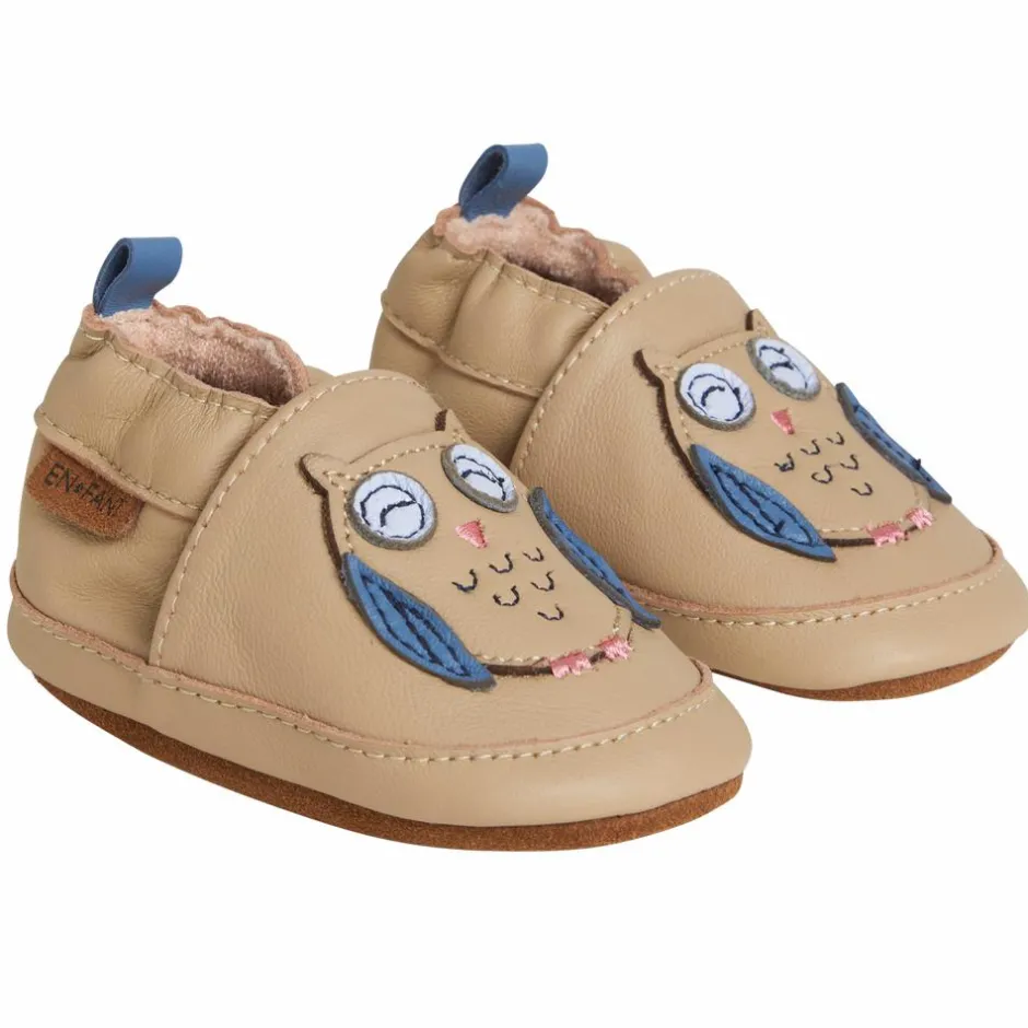 En Fant læder hjemmesko lavet af 100% ægte læder med en holdbar sål. Hjemmeskoene har print af en ugle og har elastik rundt om anklen, som holder hjemmeskoen på plads.