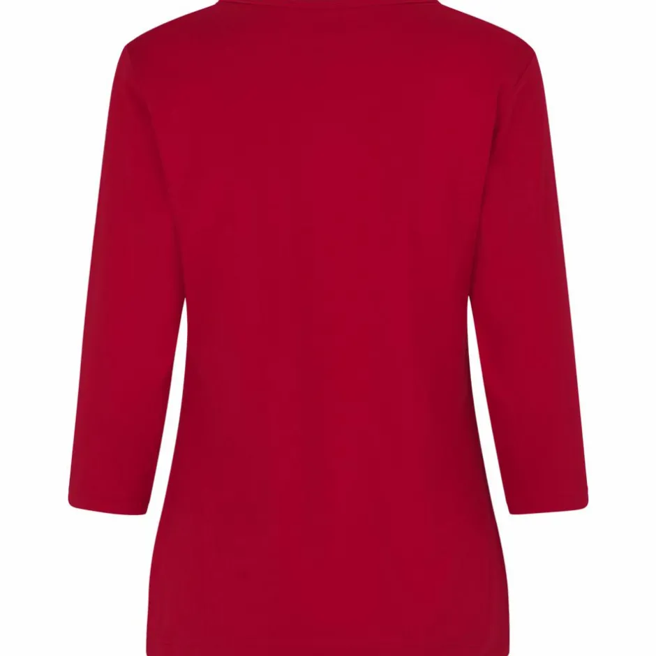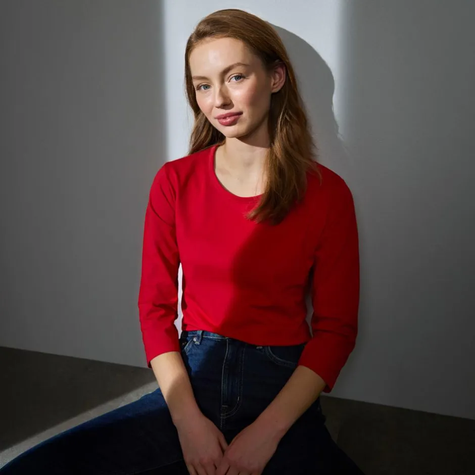 ID dame t-shirt med 3/4 ærmer. Trøjen er i ekstra slidstærk kvalitet med rund hals og slids i siden. Den har gennemgået en forkrympningsproces for ekstra stabilitet og lang levetid. T-shirten er let figursyet.