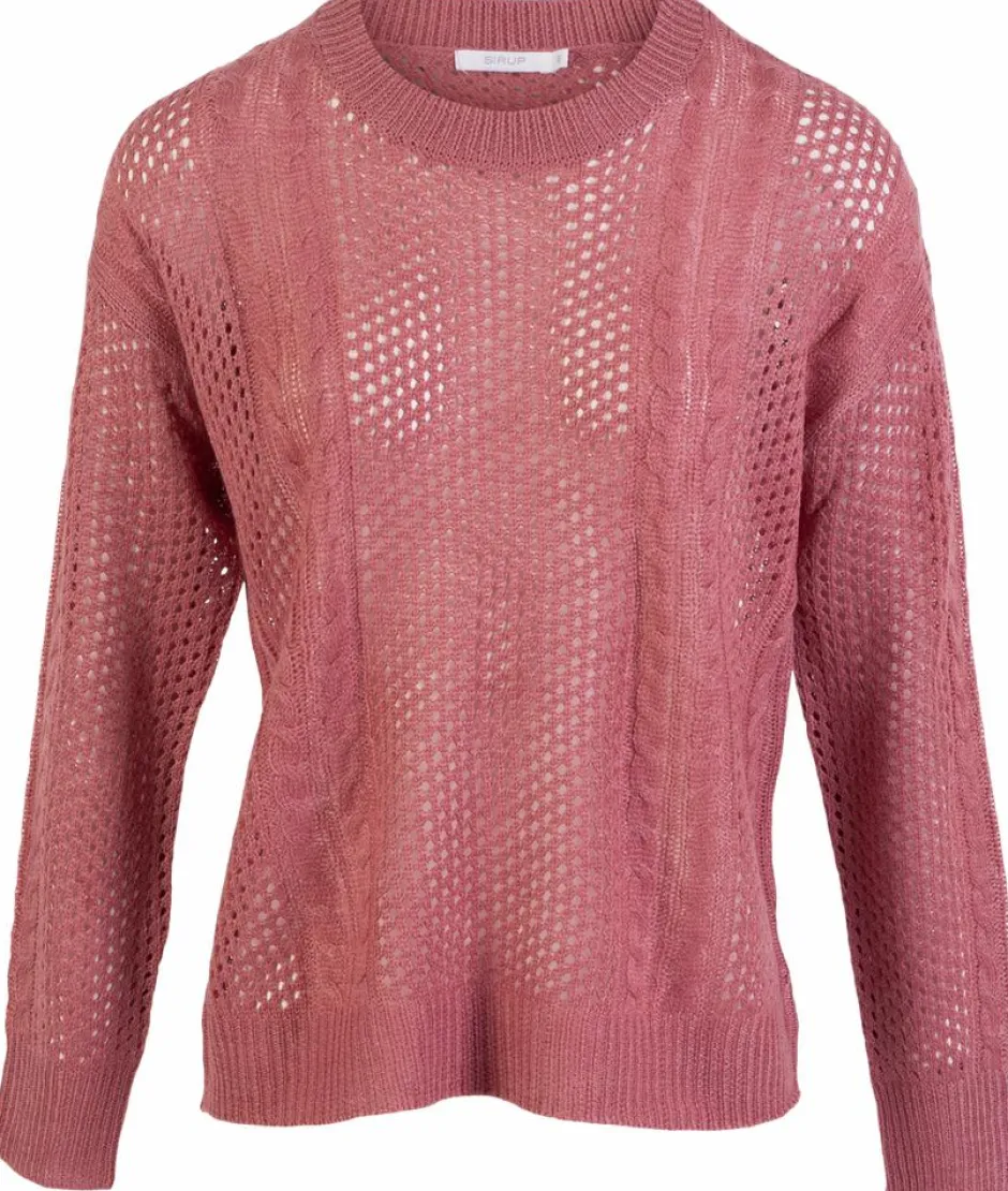Sirup dame strik. Feminin tynd strik bluse i flot hulmønster. Blusen har lange ærmer, rund halsudskæring. Striktrøjen har ribkant ved ærmegab, hals og bund.