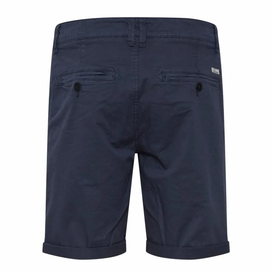 Blend shorts i ensfarvet blå. Shortsene har sidelommer samt baglommer. Shortsene har en klassisk lynlås, knappelukning og bæltestropper. Det er muligt at folde buksebenene ned.