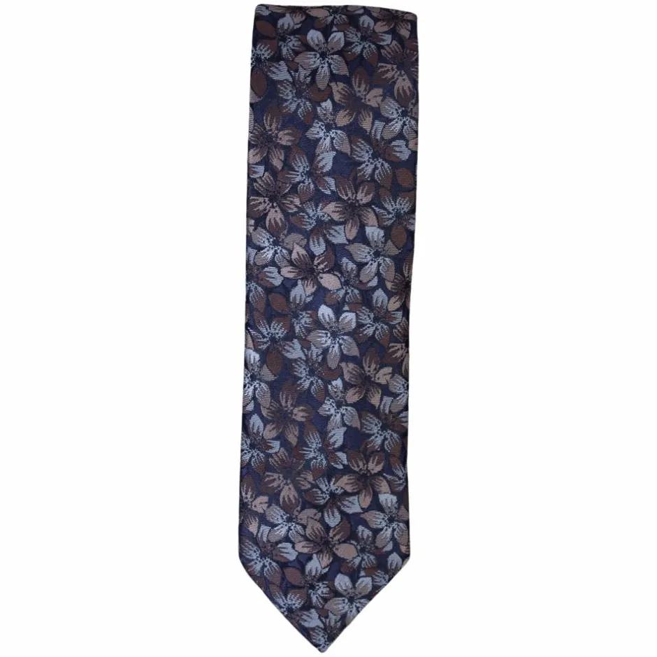 Carnét slips. Klassisk slips i blå med brunligt blomstermotiv. Bredde: 7 cm. Totallængde: 149 cm.