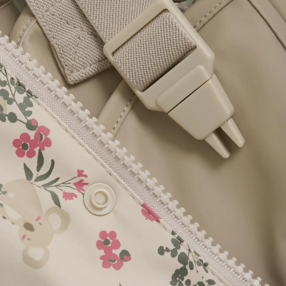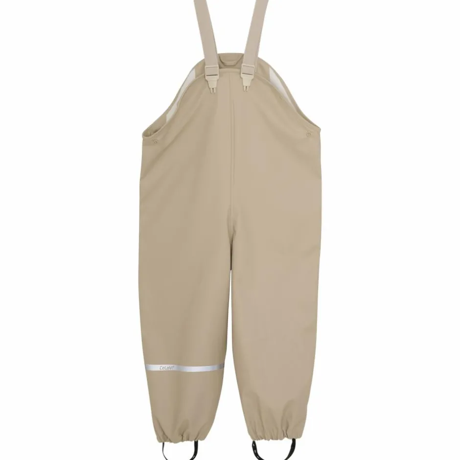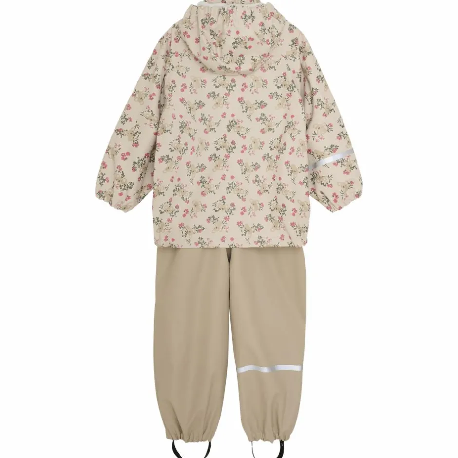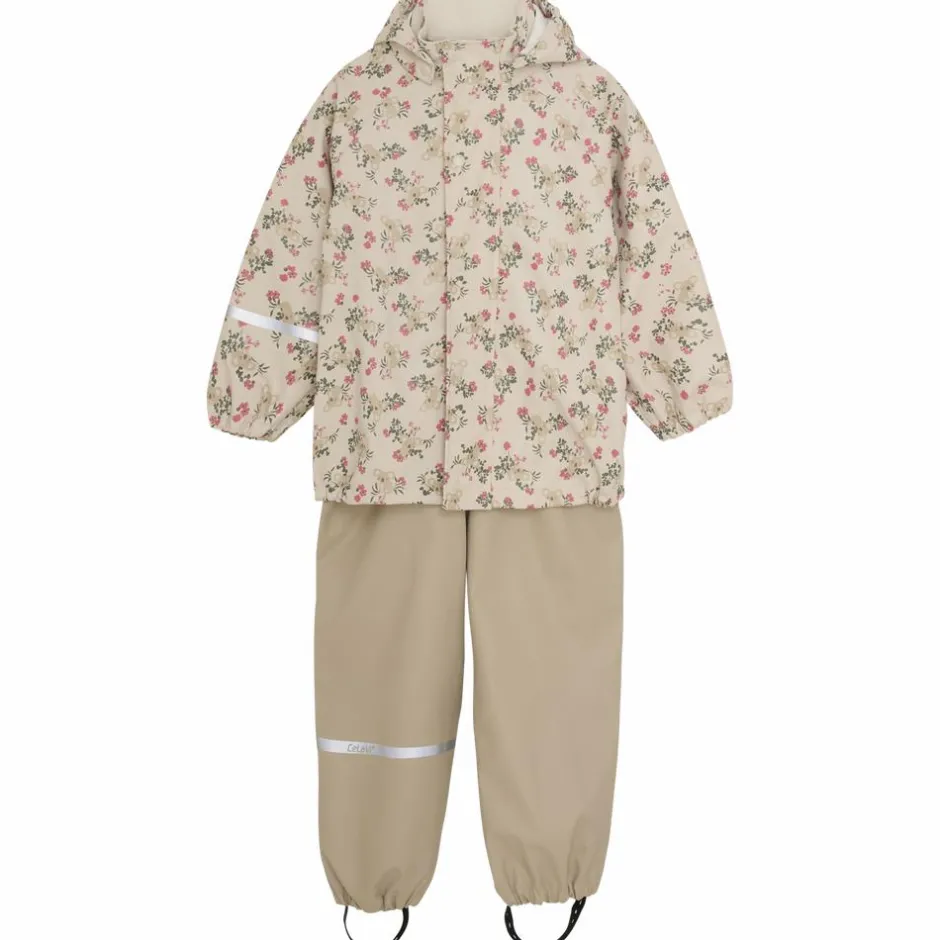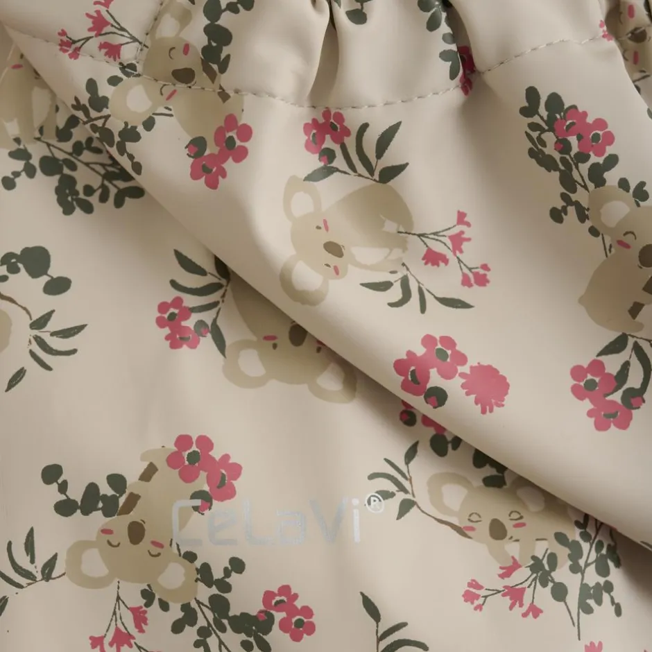 CeLaVi regnsæt indeholder regnjakke med all-over print, og bukser i ensfarvet sand. Regnsættet har reflekser på den ene overarm, på det ene ben og på hætte. Jakken har en aftagelig hætte, og ærmer og talje har elastik. Jakken har en lynlåsåbning og har en udvendig vindbryder, som lukkes med trykknapper. Sættet har seler i bukserne t.o.m. str. 104.