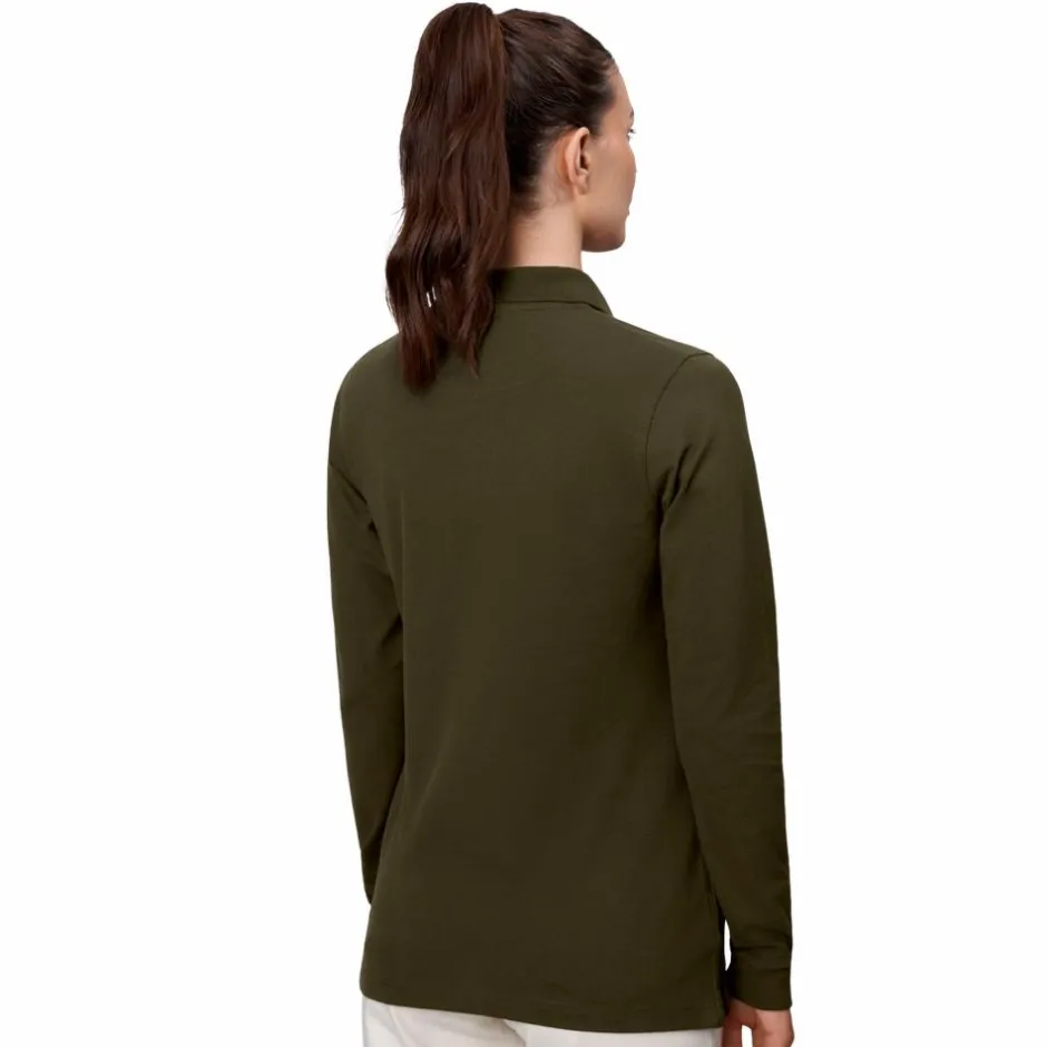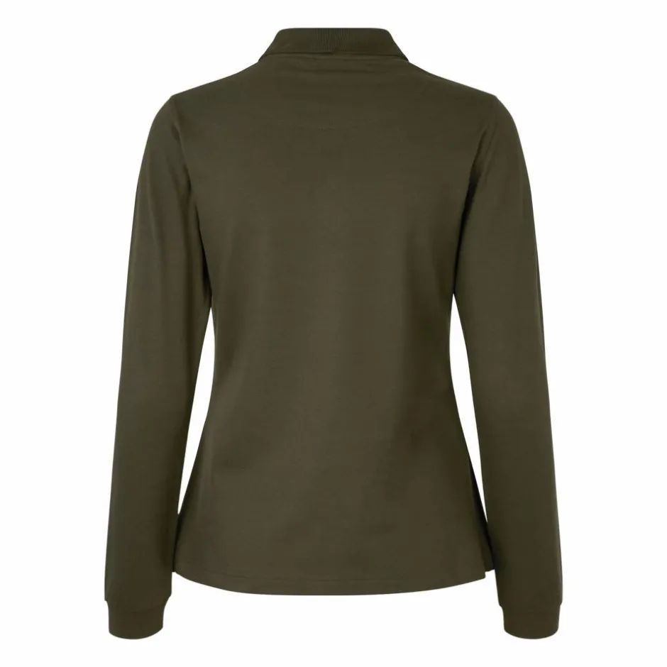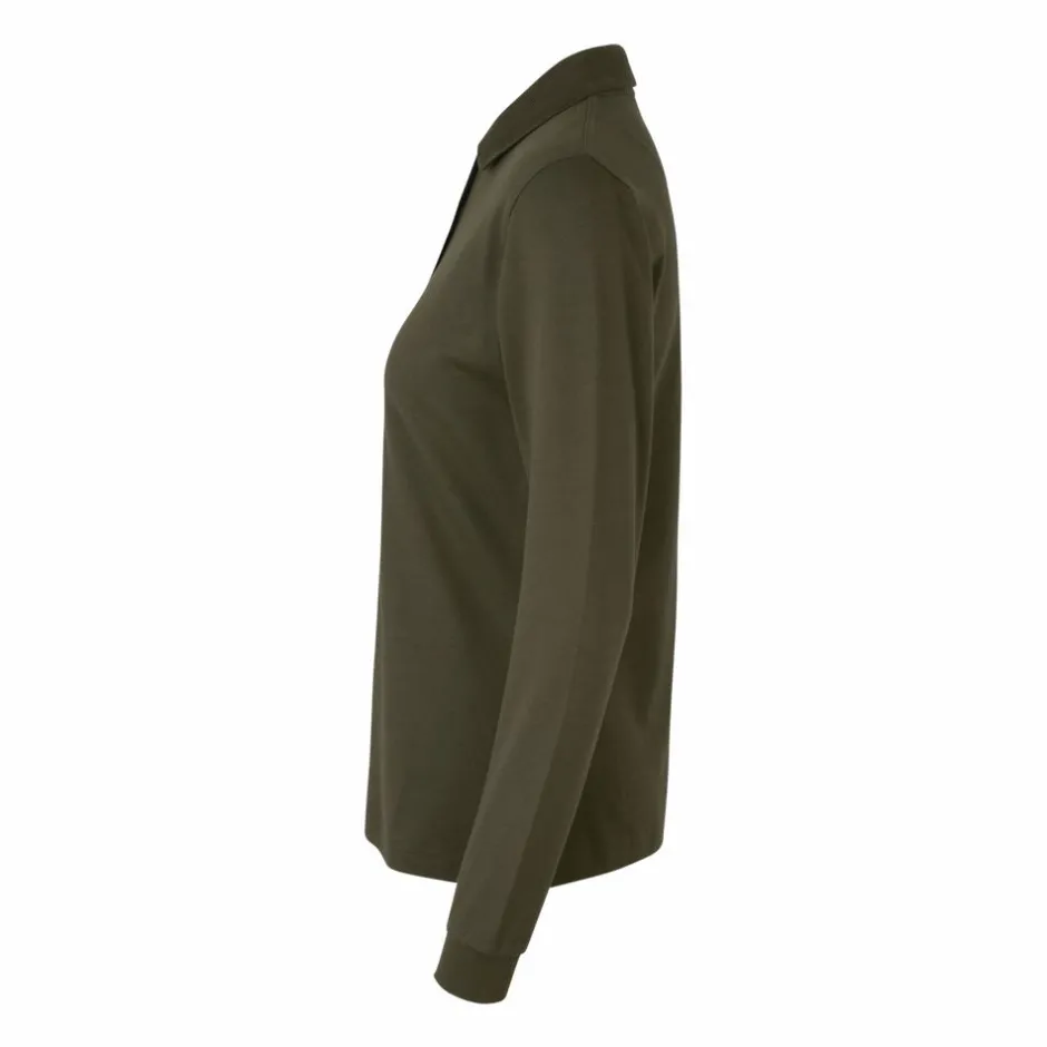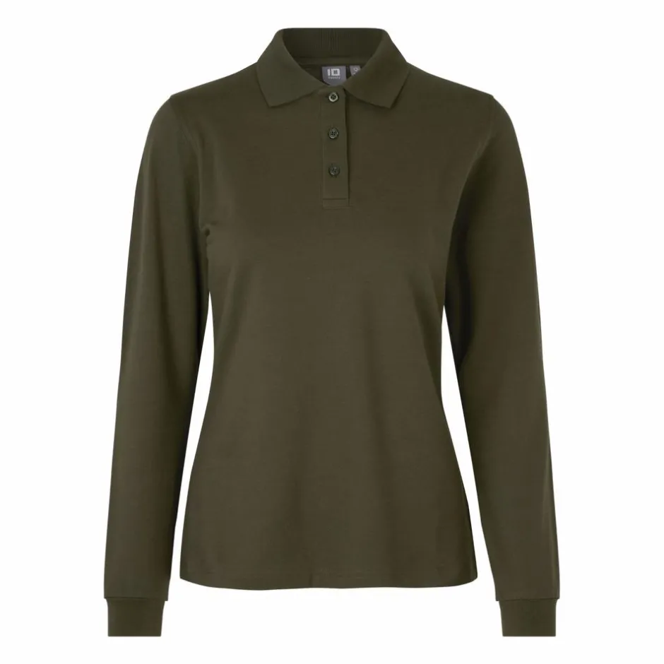 ID dame poloshirt med stretch. Polotrøjen har lange ærmer med elastik rib i enden. Trøjen har krave med knappelukning.