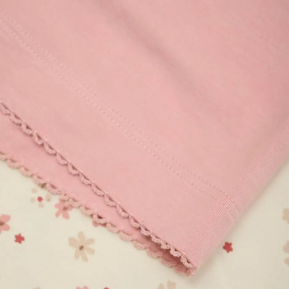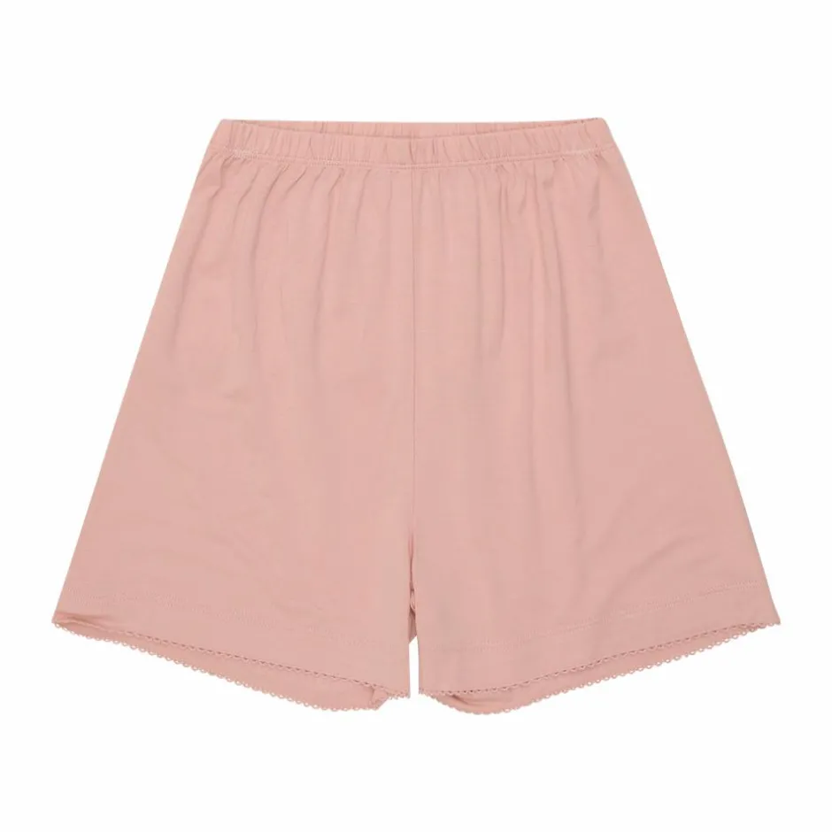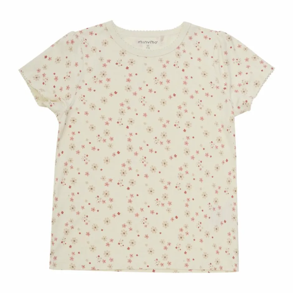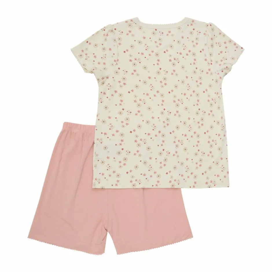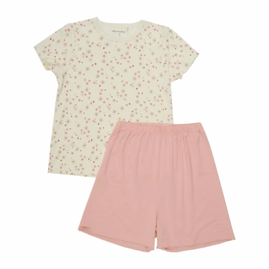 Minymo pyjamassæt med t-shirt og shorts. T-shirten har all-over print med blondekant langs halsen og ærmerne. Shortsene er i ensfarvet lyserød med elastik i taljen, og blondekant i bunden.