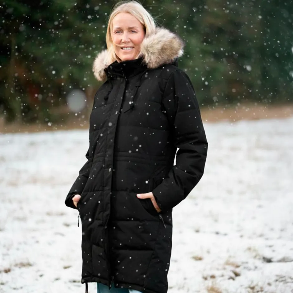 Lang dame vinterjakke med gennemgående knap- og lynlåslukning. Jakken har aftagelig hætte med aftagelig pels samt snøre. Jakken har to lommer med lynlås samt en lomme med lynlås indvendig. Det er muligt at snøre jakken ind i ryggen, så den får en flot pasform og i bunden af jakken. Jakken har varmt plys for indvendig i den øverste del og gemt ribkant i ærmegabet.
