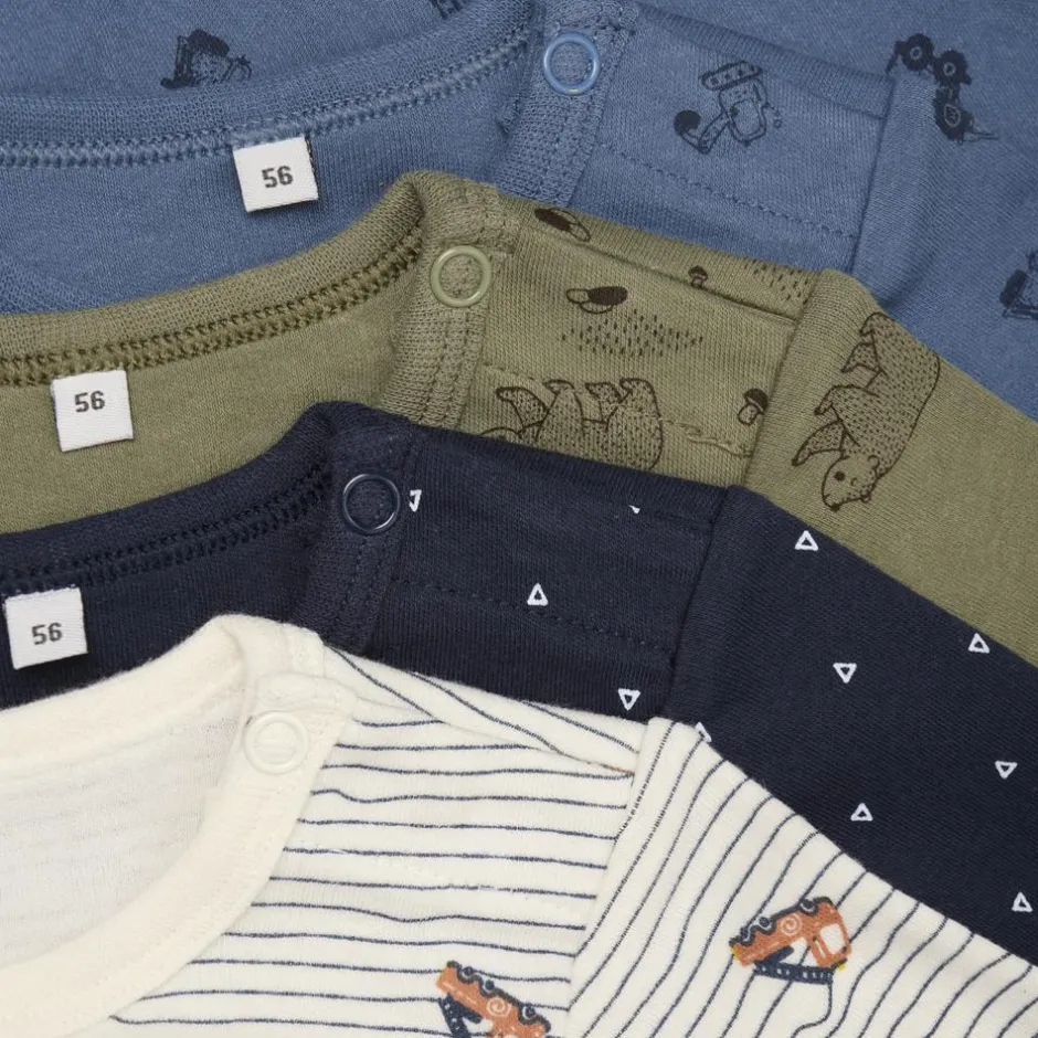 Pippi 4-pak med baby langærmede bodyer. Denne bodystocking har trykknap ved halsåbningen for nem af – og påklædning, samt 3 trykknapper ved skridtet, så det er let at skifte ble.