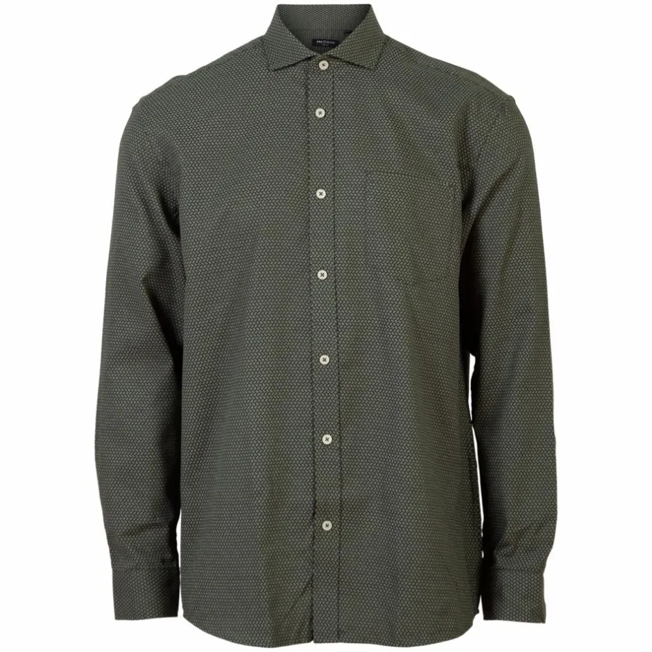 Pre End herre skjorte. Skjorten er grøn med små, hvide detaljer og har gennemgående knappelukning. Der er knapper i ærmerne, som gør at den kan tilpasse sig om armene. Skjorten har en brystlomme.