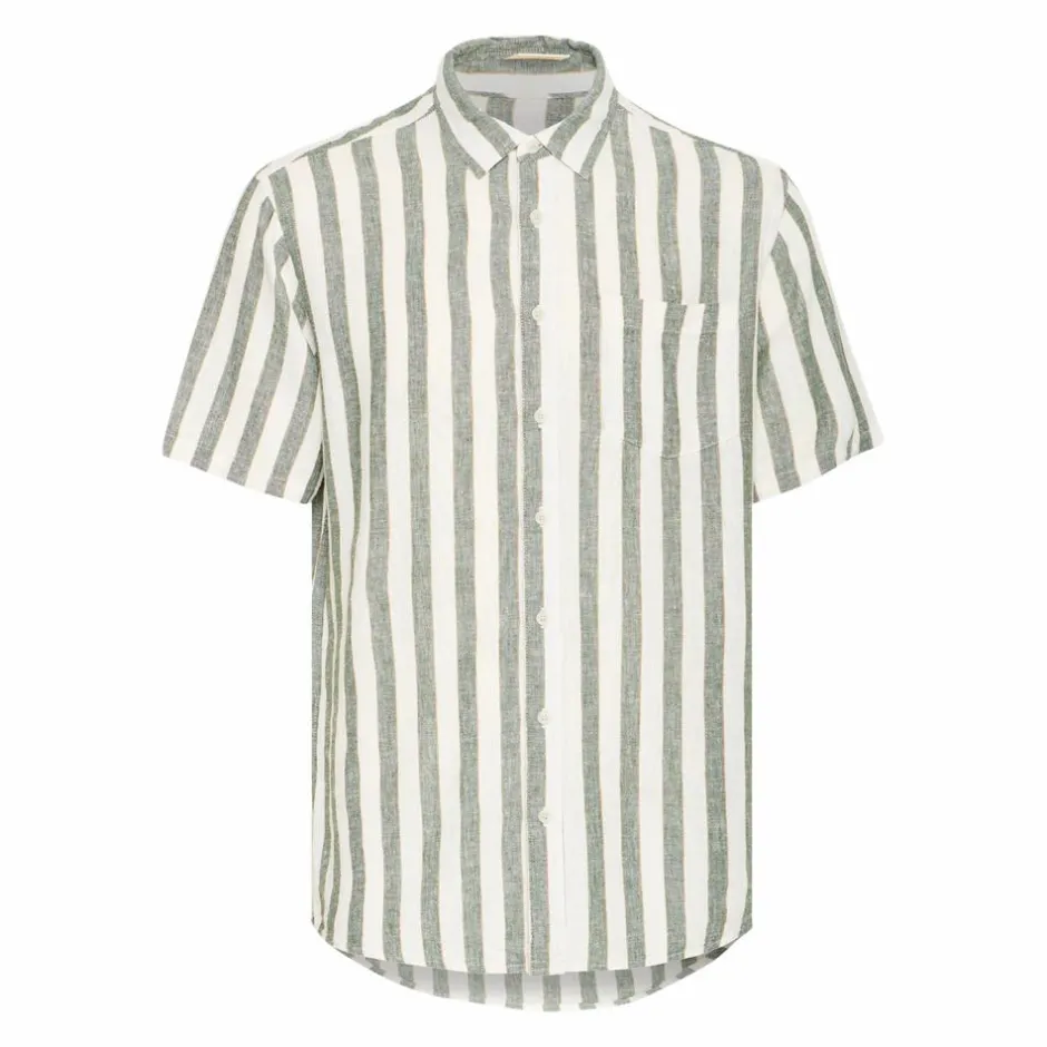 Blend plus size kortærmet herre skjorte i hørmix. Skjorten har grønne striber ned langs trøjen med små brune striber rundt om. Skjorten har en klassisk skjortekrave, knapper ned langs trøjen og en lomme på venstre side.