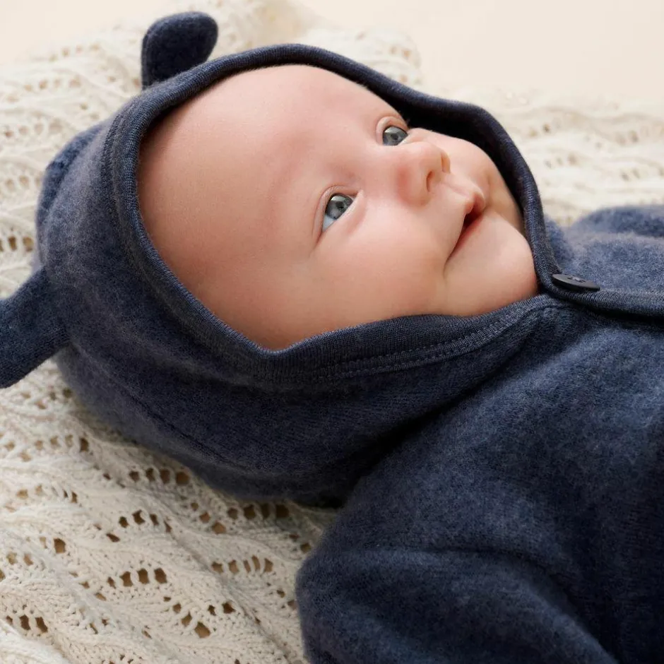 Fixoni blød heldragt i blødbørstet merino uld. Dragten har en hætte med påsyede ører og gennemgående knaplukning. Den lækre køredragt har lange ærmer med et praktisk ombuk ved hænderne, så der kan lukkes af for kulde og vind. Ulddragten er lukket ved fødderne, så de holdes dejligt lune.