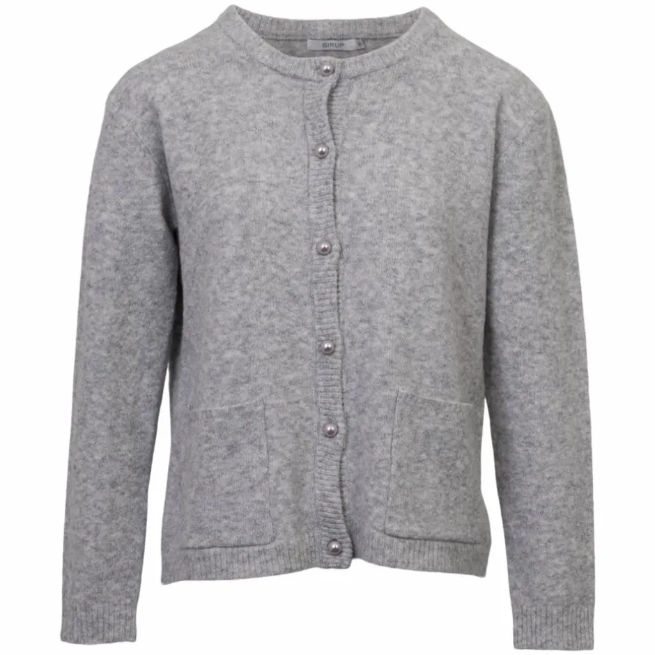 Sirup cardigan i en blød og stilren gråmeleret farve. Cardiganen har en rund halsudskæring og dekorative perle knapper, samt to små fine lommer.