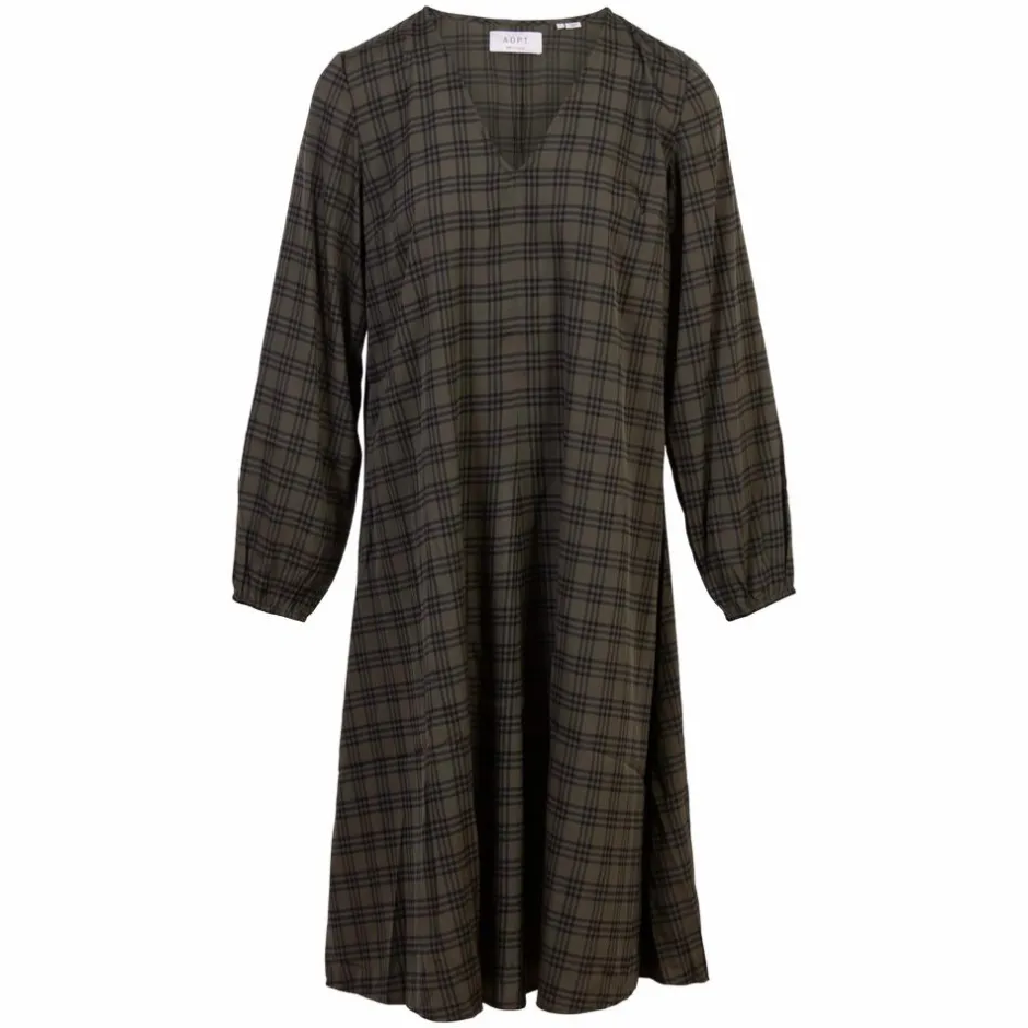 ADPT Emma dame kjole. Kjolen har gennemgående mønster, samt har den v-hals. Kjolen har elastik i ærmerne, så de tilpasser sig om armene.