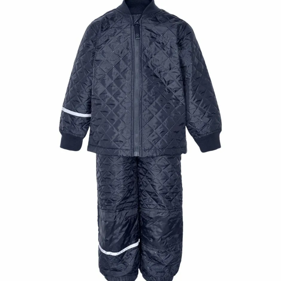 CeLaVi børne termosæt. Lækkert termosæt til baby og børn bestående af termojakke og termobukser. Jakken har en gennemgående lynlås og praktisk hagebeskytter og uundværlig refleks på det ene ærme. Yderligere har jakken justerbar elastik i bunden, samt ribkant ved hals og ærmegab. Der er en indvendig vindstolpe i jakken. Bukserne har elastik i linningen og ved anklerne. Bukserne har refleks rundt om det ene ben, og termobukserne har også en praktisk forstærkning på både knæ og numse. Det fine og uundværlige termosæt bestående af termojakke og termobukser er vindtæt.