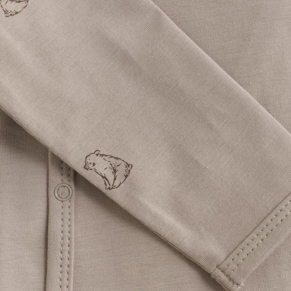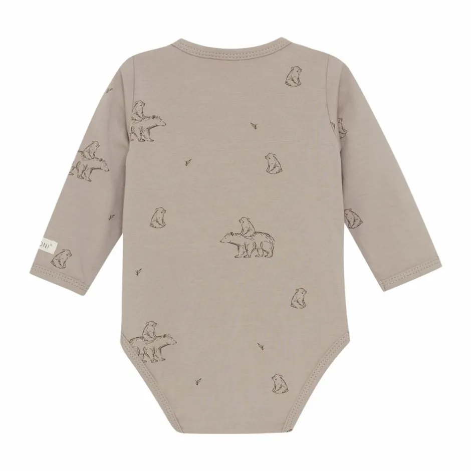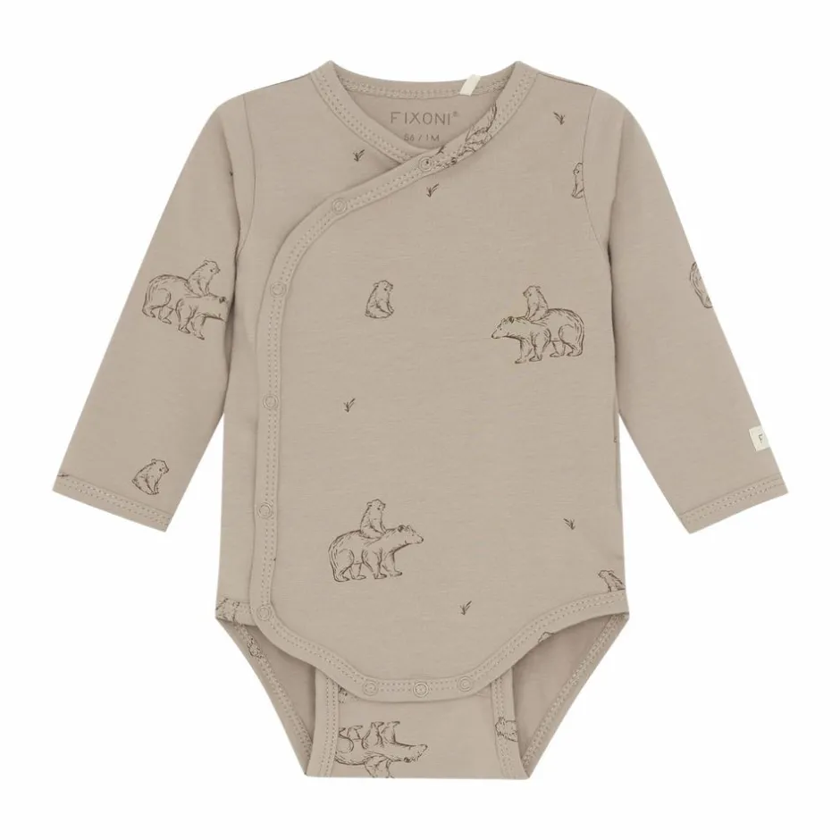 Fixoni baby body med lange ærmer og print af små isbjørne. Bodyen kan åbnes helt op fortil med trykknapper så bodyen ikke skal ned over hovedet på baby. Bodyen har ligeledes trykknapper i skridtet og der er et lille fint logo på det ene håndled.