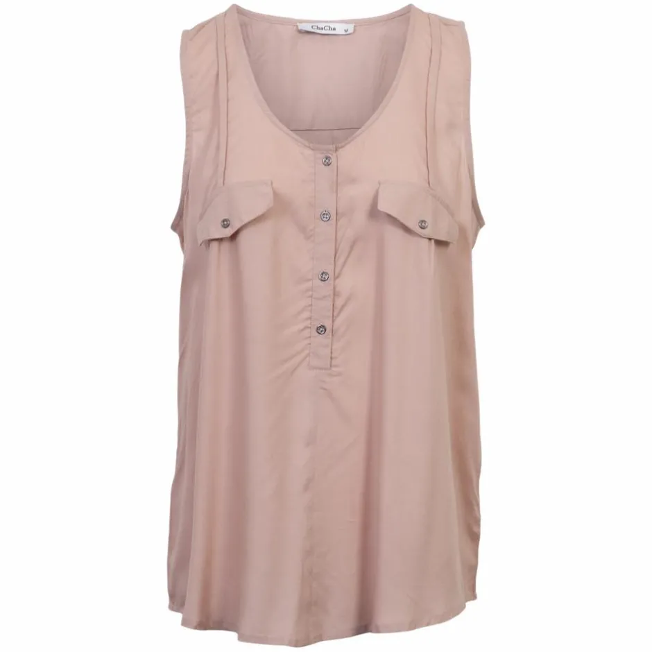 Cha Cha dame top. Smart top med brede stropper. Toppen har pyntelommer på brystet, samt knappelukning ved den runde halsudskæring.