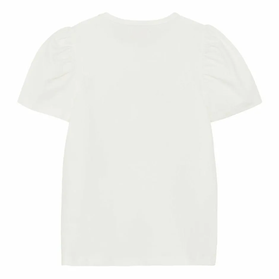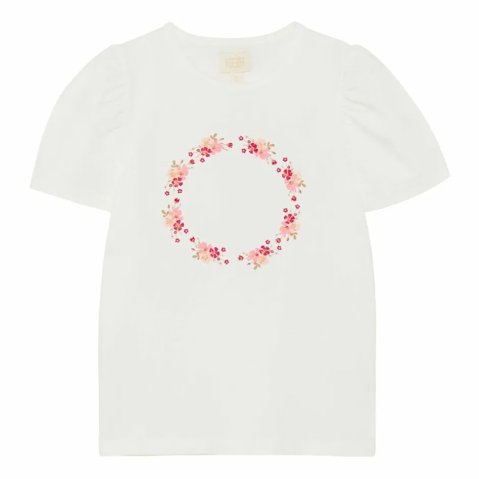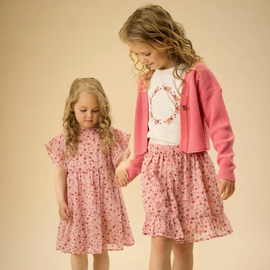 Den lette t-shirt til piger kombinerer en rolig rose smoke nuance med et fint blomsterkransmotiv på brystet. Den runde hals og korte pufærmer giver et charmerende udtryk og en behagelig pasform, der følger med i leg og hverdagsrutiner. Sæt den sammen med bløde leggings, eller se flere t-shirts og toppe til garderoben.