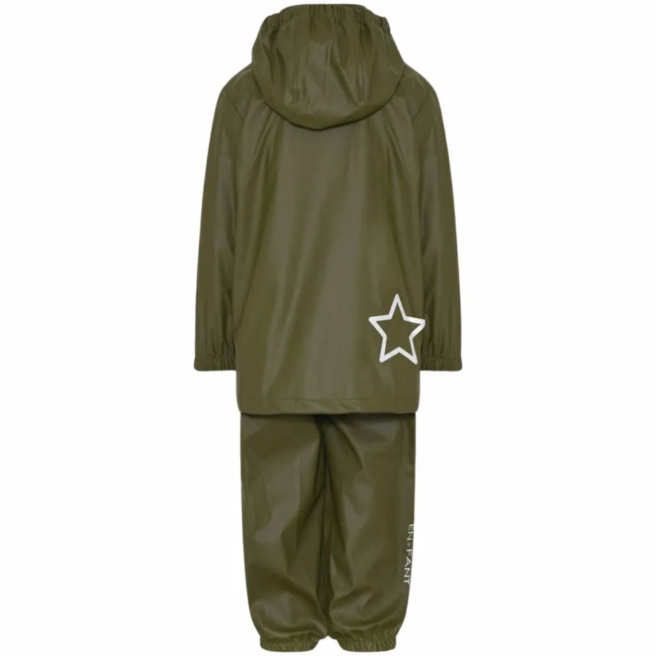 En Fant børne regntøj sæt. Todelt regnsæt bestående af en regnjakke og et par regnbukser. Jakken har knap- og lynlåslukning, aftagelig hætte og to lige lommer foran. På lommerne er brandet “En Fant” trykt, og det fine sæt til børn har flere refleks detaljer på både jakke og buks. Ærmerne har elastik og bunden af jakken kan strammes ind på indersiden ved behov. Bukserne har elastikkant i taljen og kan også snøres ind ved hjælp af en elastisk som sidder på indersiden i taljen. I buksebenene er der også elastik samt en rem til at slå om støvlerne, så bukserne ikke kravler op. Bukserne har smæk t.o.m. str. 104.