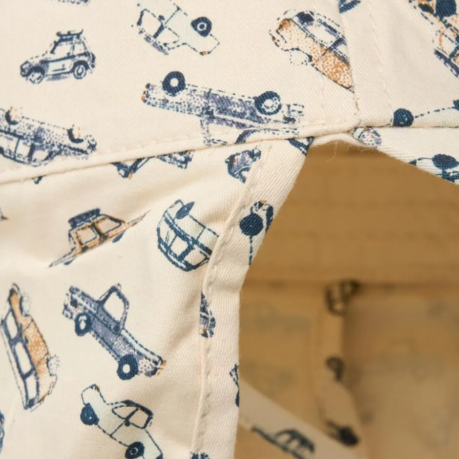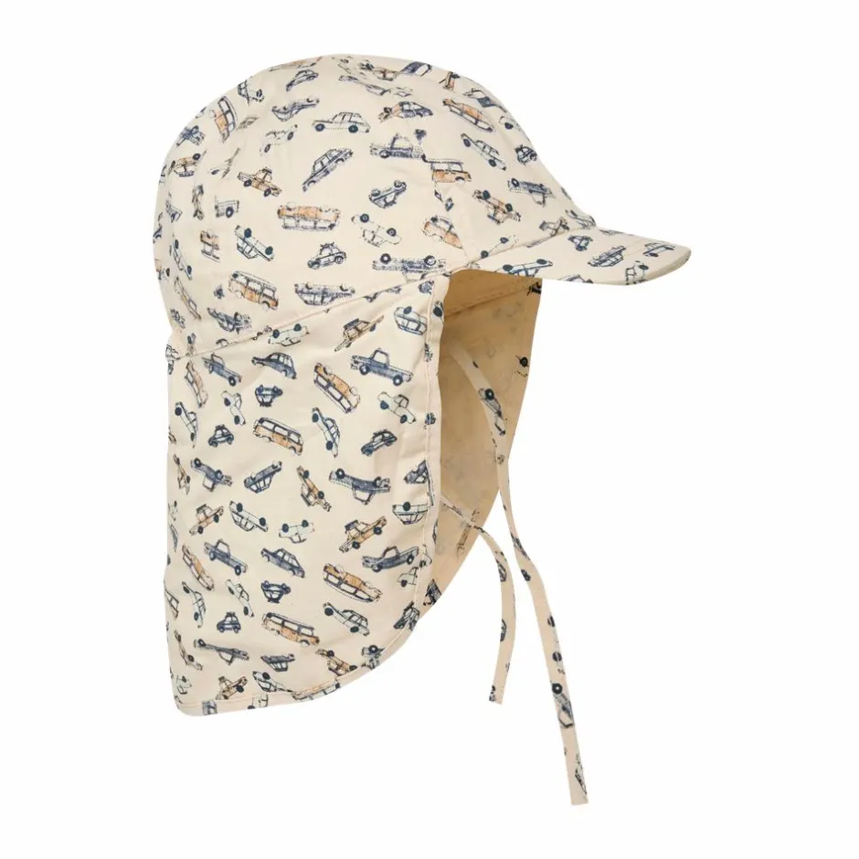 En Fant børne solhat. Smart sommerhue med praktisk kasketskærm og lang skygge bagpå. Elastik på baghovedet og snore under hagen sikrer, at hatten sidder godt på barnets hoved.