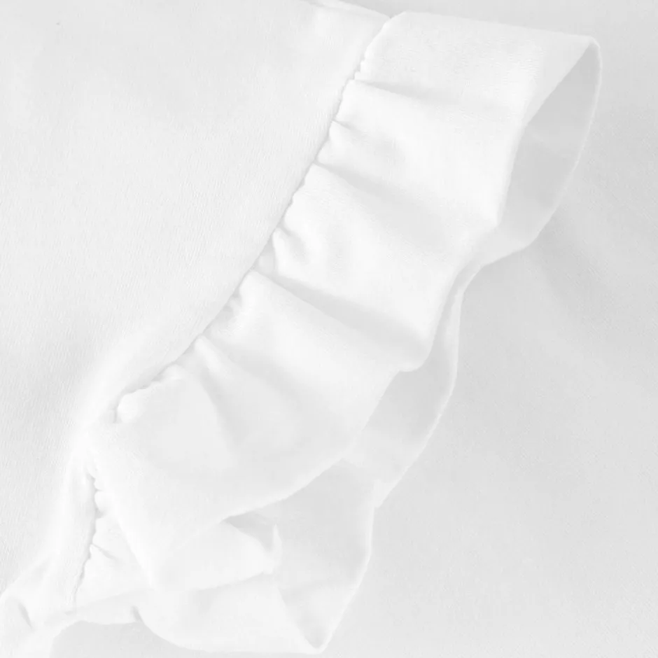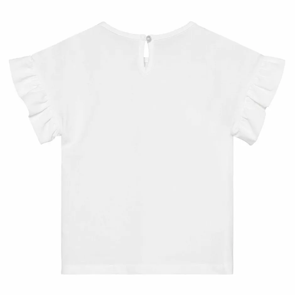 En let overdel i egret med korte rynkeærmer og rund hals giver et venligt udtryk og masser af bevægelsesfrihed. Det blide blomsterprint på fronten og den lille knap i nakken gør den både fin og praktisk til piger i alle aldre.