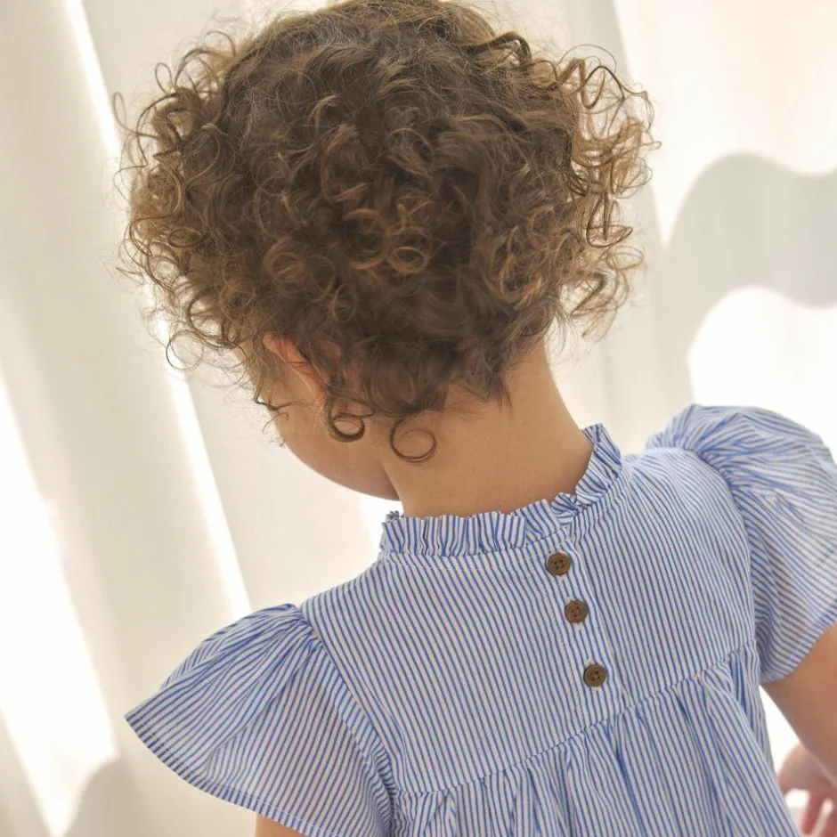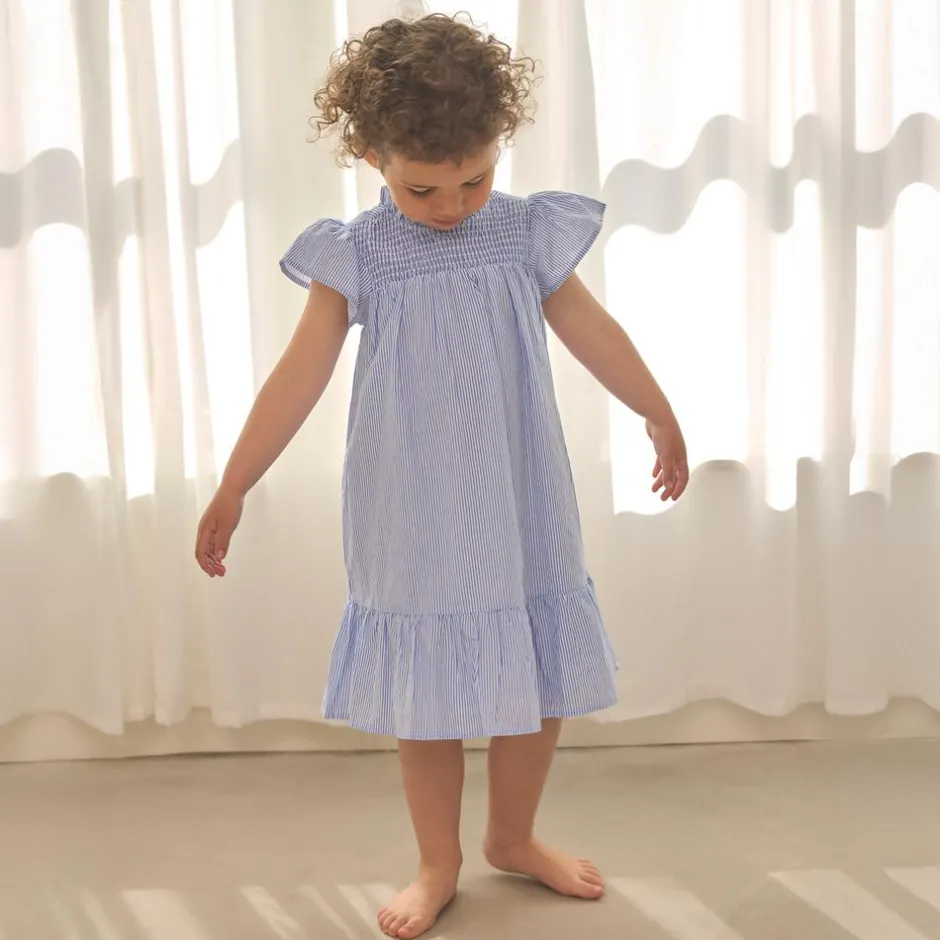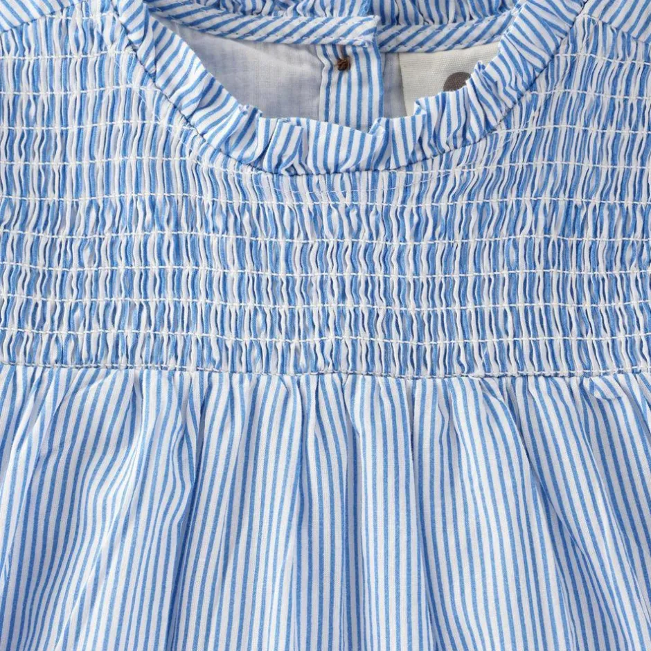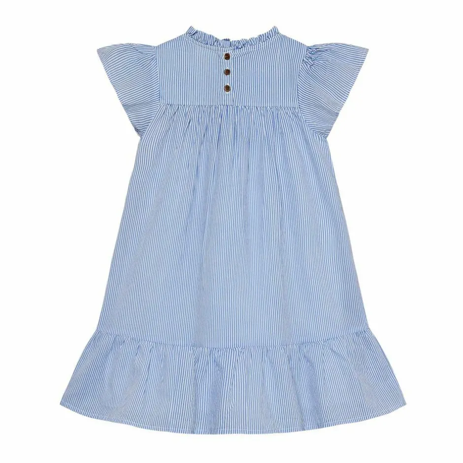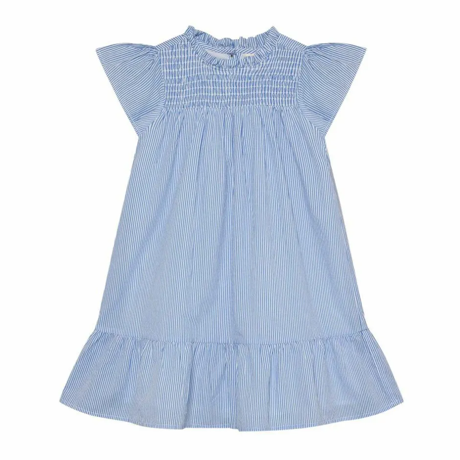 Den lyseblå nuance med hvide, lodrette striber giver et frisk udtryk, der klæder alt fra legeaftaler til familieture. Den smockede overdel former sig blidt, mens a-formen falder let og giver frihed til at bevæge sig. Korte flæseærmer, rynket hals og en diskret flæsekant ved nederste søm samler det hele i et sødt, velafbalanceret look. 100% bomuld føles blødt mod huden og lader kroppen ånde.