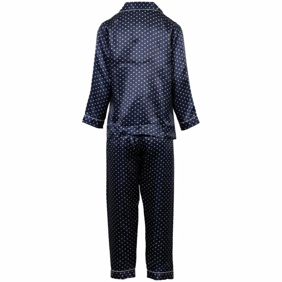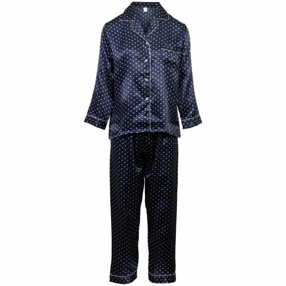 Flot damepyjamas med silke. Dejlig blød todelt pyjamassæt i et fint all-over print med små hvide hjerter. Overdelen har en fin revers hals og gennemgående knappelukning. Blusen har en brystlomme på venstre side. Natbukserne har lige ben og en løs pasform. Bukserne har en smal elastik i taljen, som sikrer at de falder pænt. Her får du et perfekt og behageligt sæt til afslapning eller til at sove i.