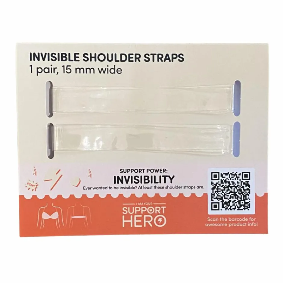 Support Hero invisible shoulder straps. Gennemsigtige og justerbare 15mm brede BH-stropper, der giver støtte uden at kunne ses under tøjet. Perfekte til toppe, kjoler og outfits med bare skuldre. Passer til de fleste BH’er med aftagelige stropper. Pakken indeholder 1 par.