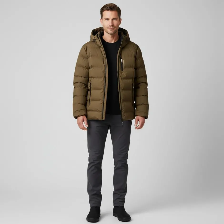 Detaljer: Hætte, 3 udvendige lynlåslommer, 1 indvendig lomme, padding, lodret logo ved brystlomme