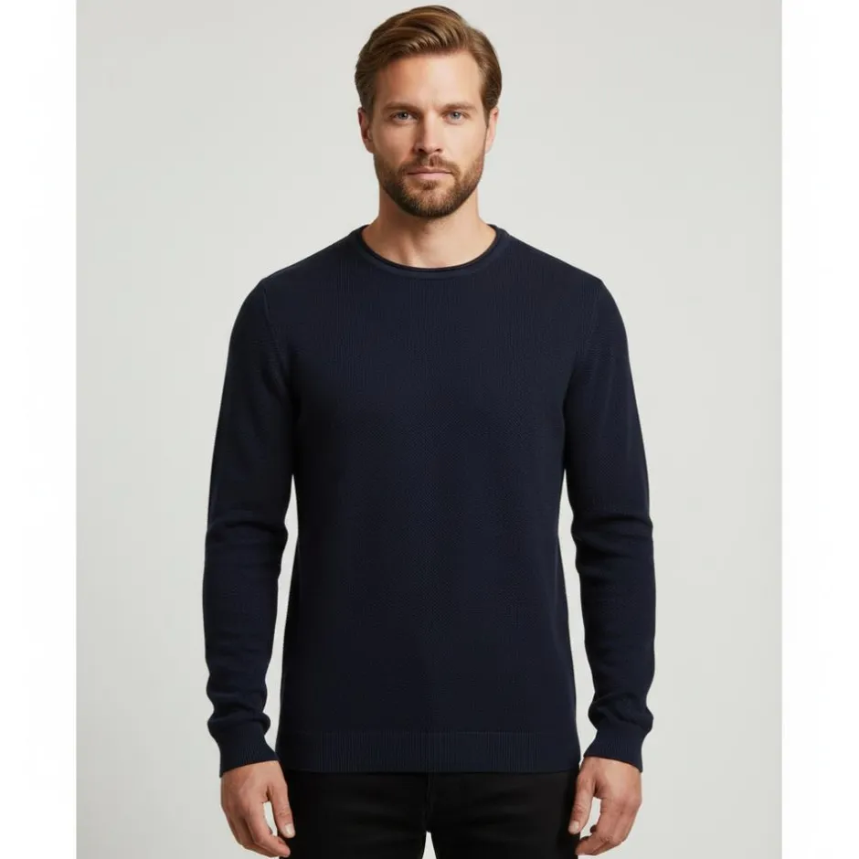 Denne strik samler hverdagsvenlig varme og et roligt udtryk. Den fine struktur og runde hals giver en pæn silhuet, der passer til alt fra kontor til weekend. Klassisk pasform gør den let at bruge alene eller over en skjorte.