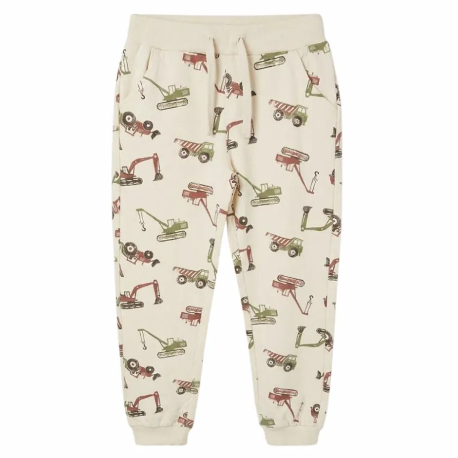 Sandfarvet base i nuancen sandshell får et charmerende løft af et motiv med byggepladsens maskiner. 100% bomuld føles blødt mod huden og lader kroppen ånde, mens regulær pasform, rib i talje og ved ankler samt justerbar snøre sikrer en tryg og fleksibel pasform. Modellen er skabt til leg, institution og rolige stunder hjemme. Se også flere sweatpants til hverdagen.