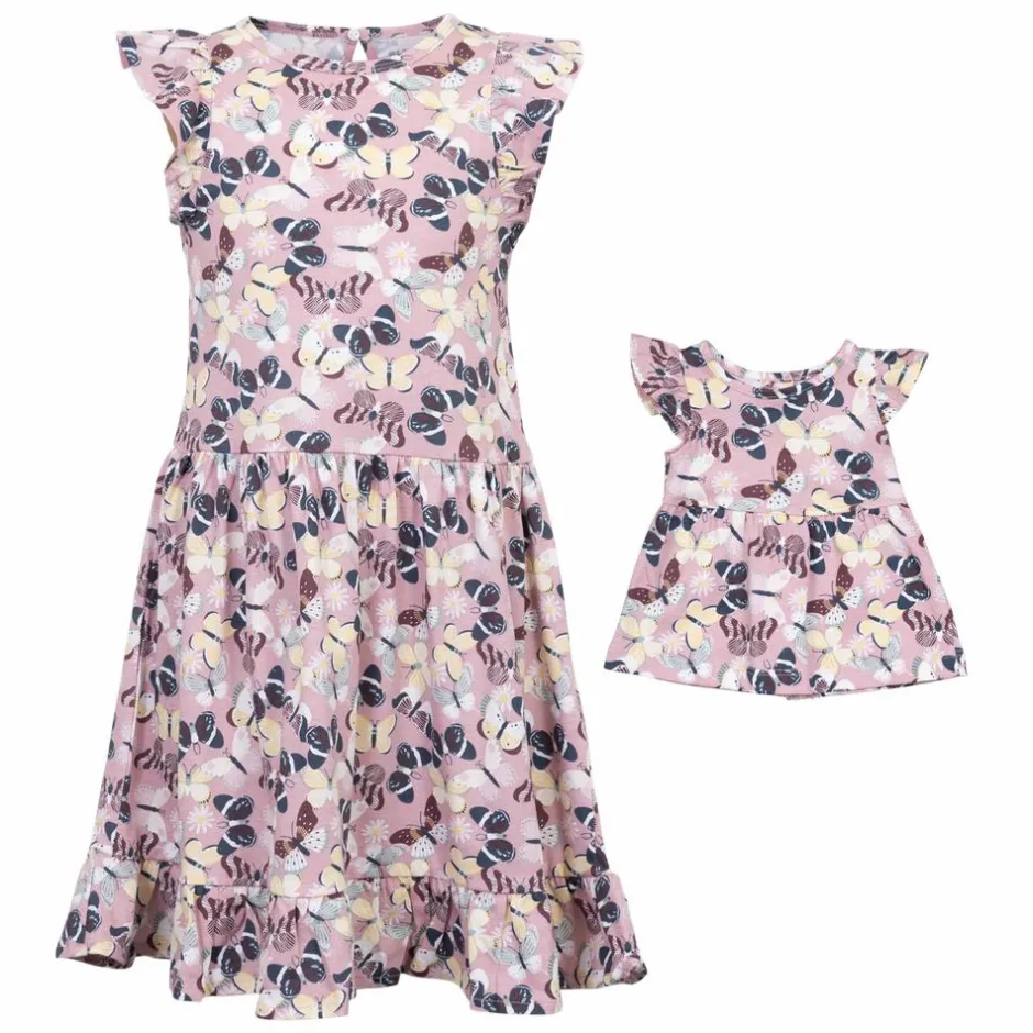 Me too pige kjole med all over print. Kjolen har korte ærmer med flæsedetaljer. Kjolen har en syning ved taljen, som skaber et let V-formet skørt. Der medfølger en matchende dukkekjole