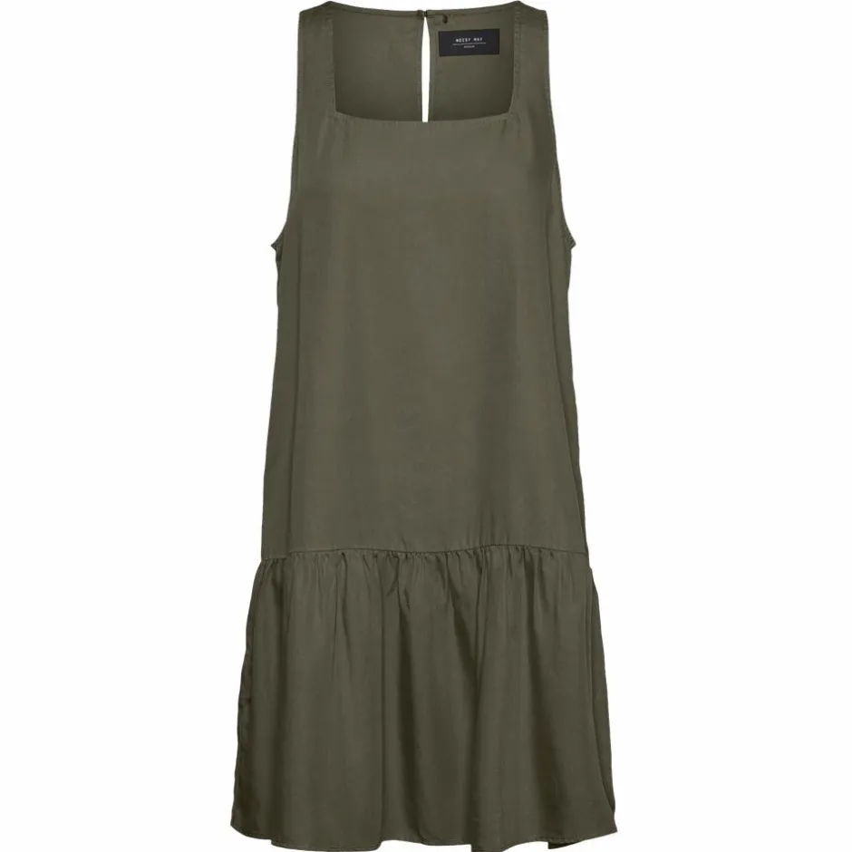 Noisy May Emilia kjole. Smart ærmeløs kjole med firkantet udskæring samt skæring forneden. Kjolen lukkes i nakken med en lille knap.