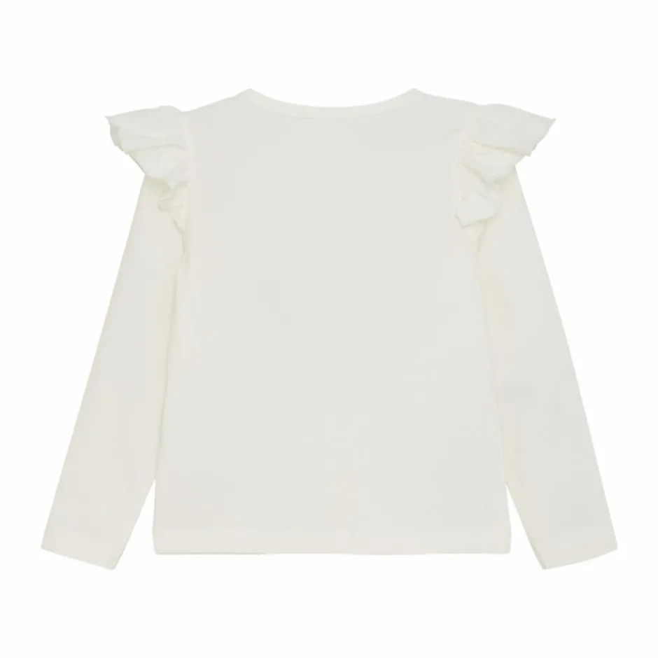 Creamie bluse med et stort blomsterprint med pailletter. Blusen har flæser ved skuldrene, og er lavet i en lækker, tyk bomuldskvalitet. I str. 80-98 er der skjulte trykknapper ved venstre skulder.