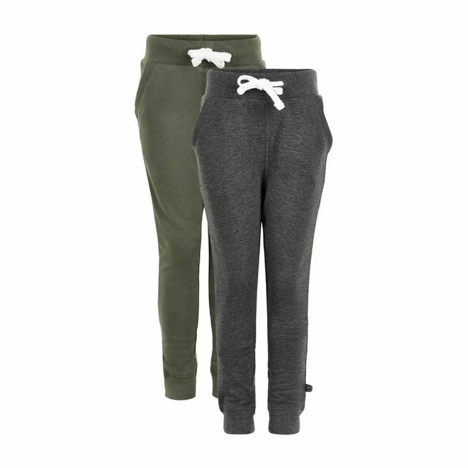 Minymo børne sweatbukser 2-pak. To par lækre sweatbukser med elastik og bindebånd i taljen, to skrå lommer samt ribkant ved hofte og ankler.