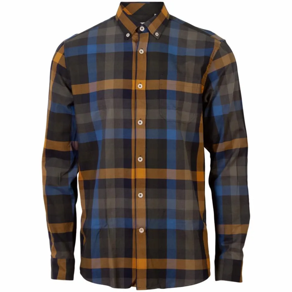 Pre End South herre skjorte. Skjorten har gennemgående tern og mønster i grønne, blå og gule nuancer samt gennemgående knappelukning. Der er knapper i ærmerne, som gør at den kan tilpasse sig om armene. Skjorten har en brystlomme.