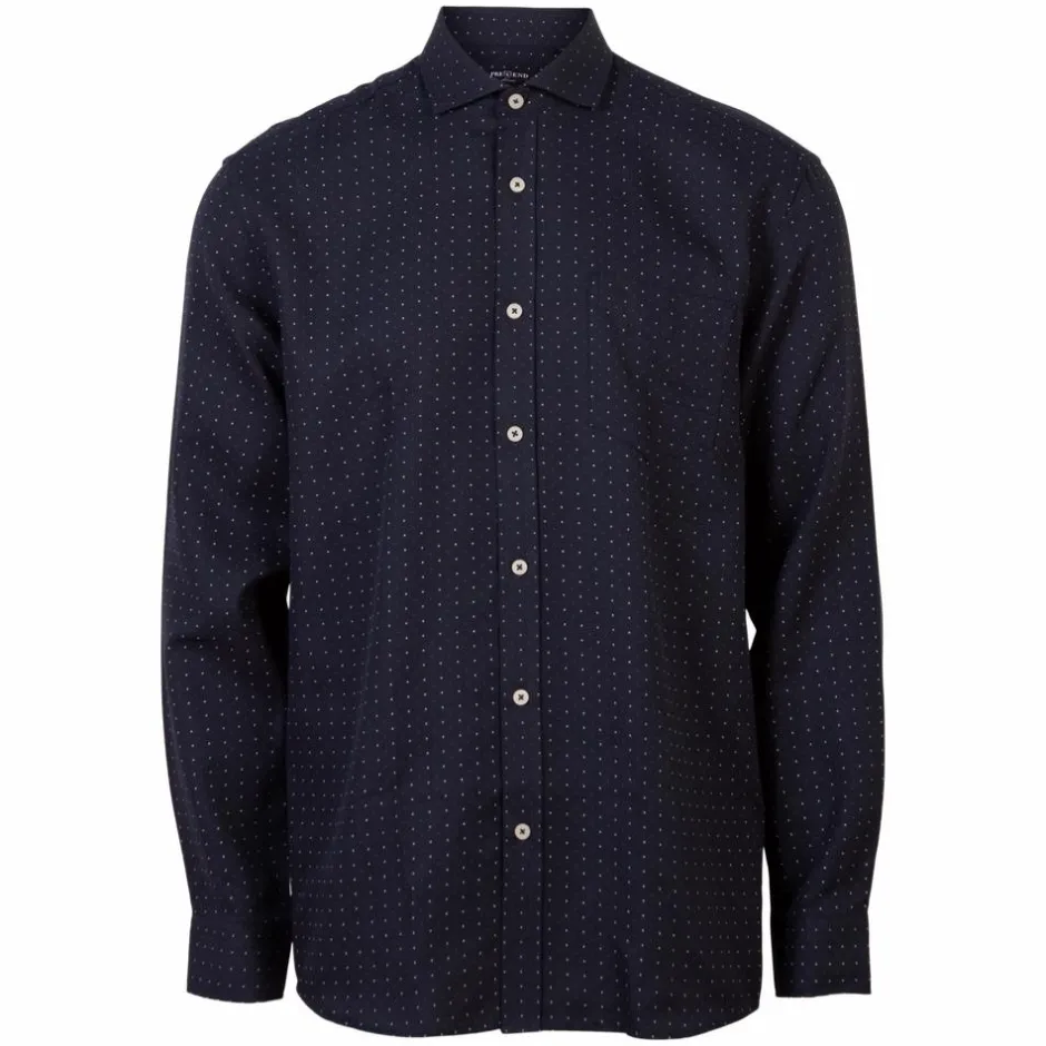 Pre End herre skjorte. Skjorten er blå med små prikker i rød og hvid og har gennemgående knappelukning. Der er knapper i ærmerne, som gør at den kan tilpasse sig om armene. Skjorten har en brystlomme.