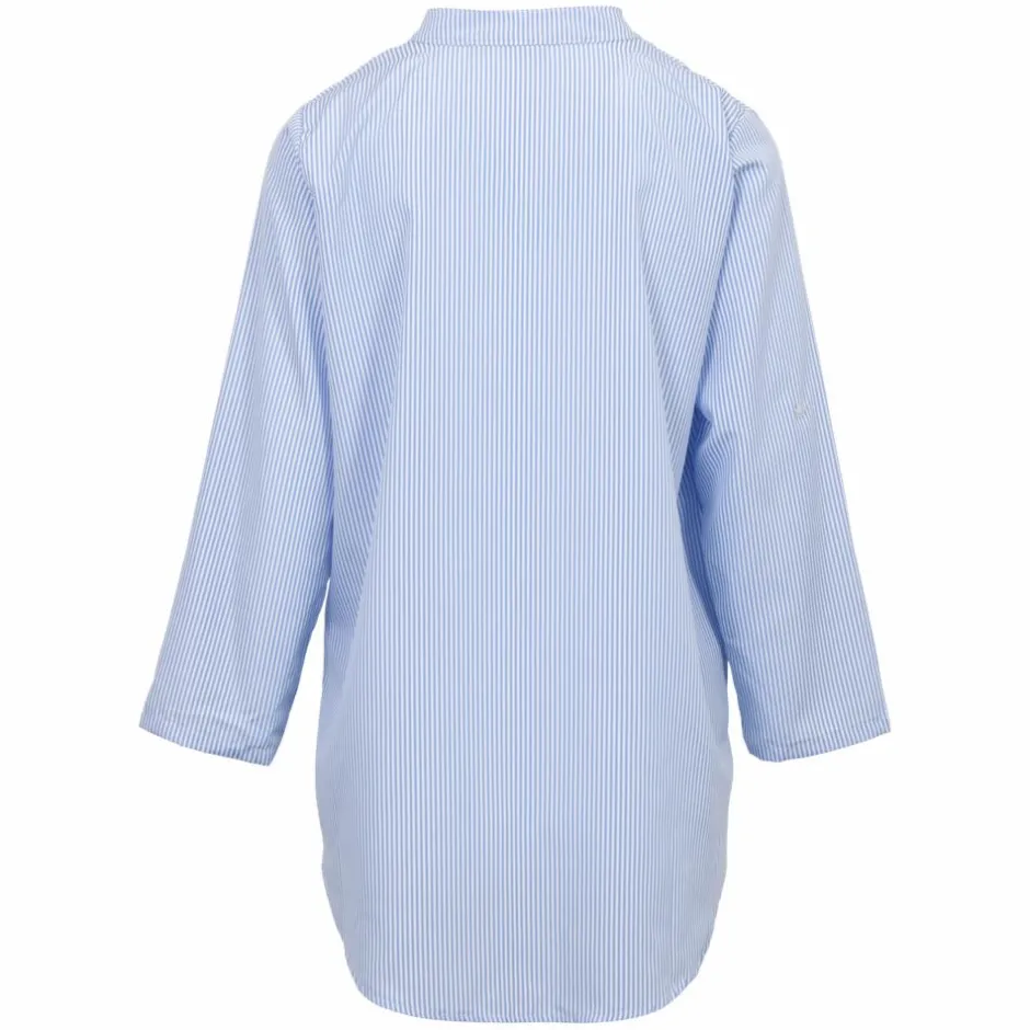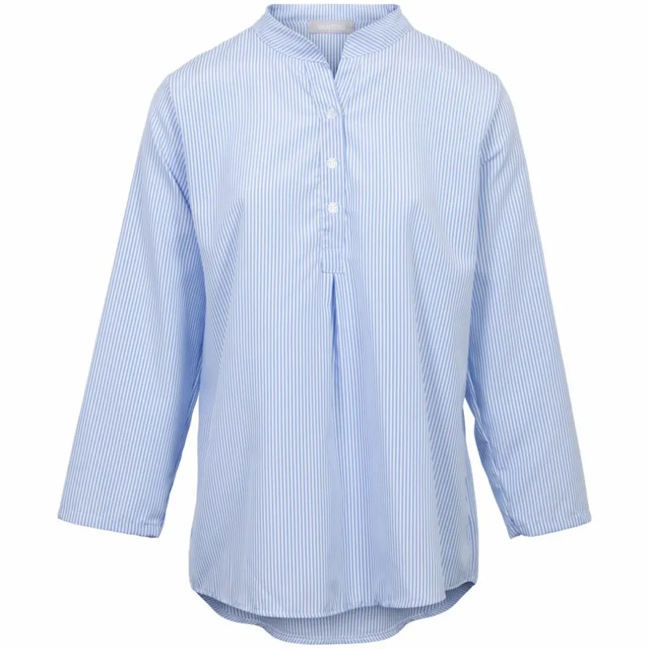 Vanting dame skjorte tunika. Feminin viskose tunika med all-over striber og V-udskæring med knapper. Skjorten har 3/4 lange ærmer, som kan reguleres i længden, hvilket giver overdelen et ekstra feminint og fint udtryk. Overdelen er fremstillet i en let viskose kvalitet og føles behagelig mod kroppen. Skjorten er rummelig og giver masser af bevægelsesfrihed og kan styles med jeans, strømpebukser eller leggins.