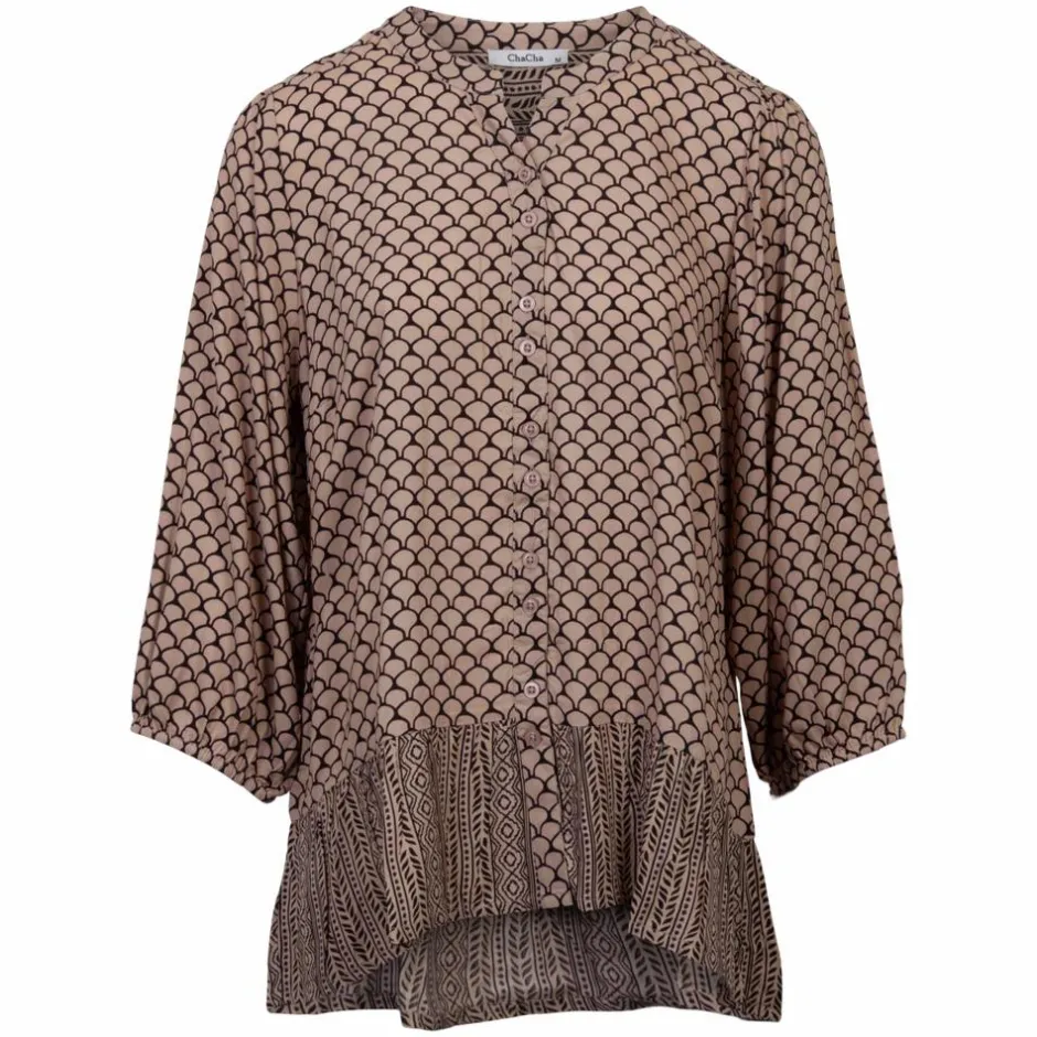 ZbyZ plus size feminin bluse i flot all-over print med v-udskæring med knapper. Blusen har 3/4 lange ærmer med en smal elastik i åbningen, som giver en flot og feminin pasform.