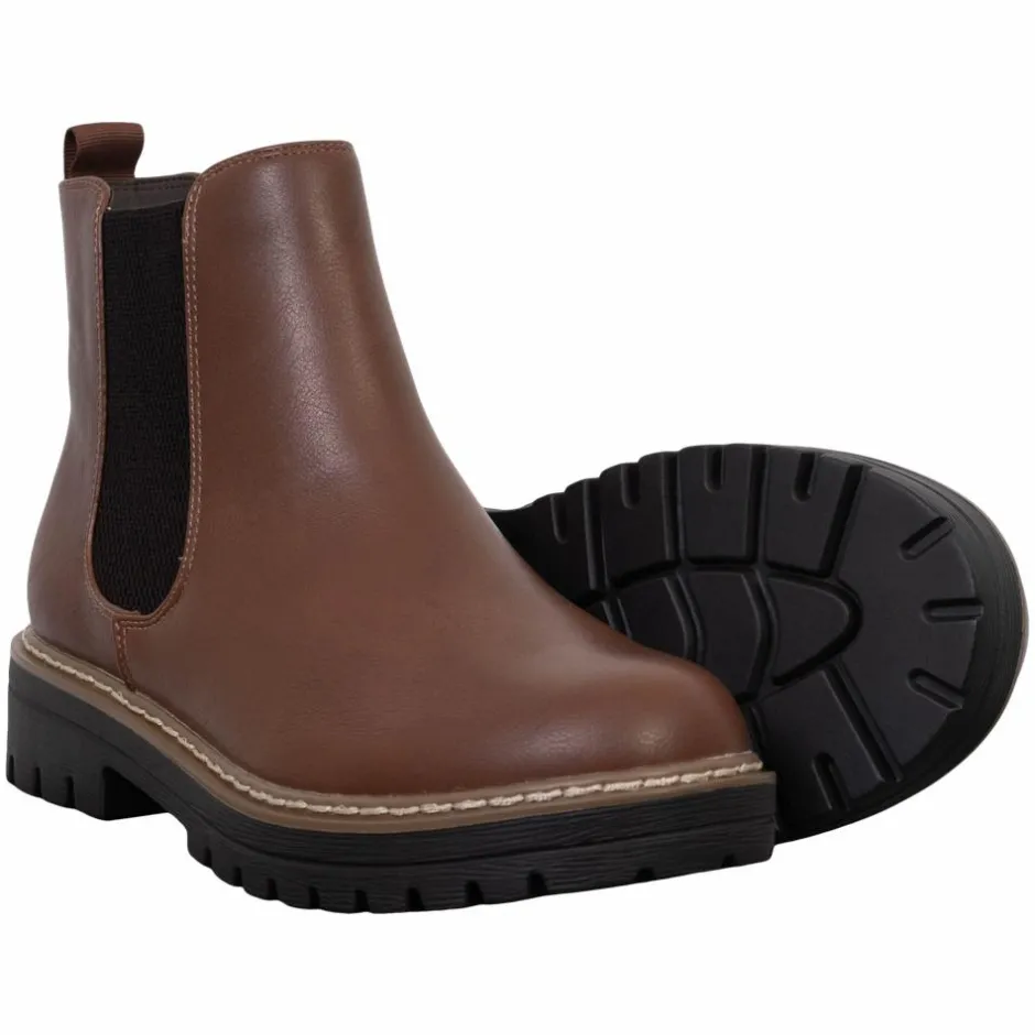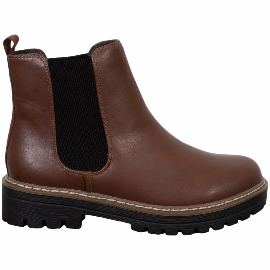 Et par brune chelsea-inspirerede støvler, der giver et roligt udtryk og en sikker pasform. Den glatte overdel i PU (syntetisk læder) spiller flot sammen med de sorte elastikpaneler, så du let kan glide i dem og komme ud ad døren. Brug dem til jeans til hverdag eller sammen med en kjole og strømpebukser samt strik og cardigans for et varmt lag.