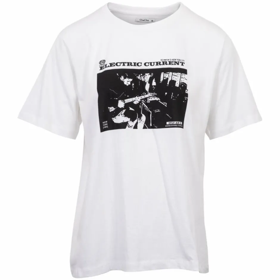 ChaCha t-shirt med print på fronten. T-shirten har en klassisk rund hals og korte ærmer. T-shirten er lavet i lækkert bomuldskvalitet, som føltes behagelig at have på.