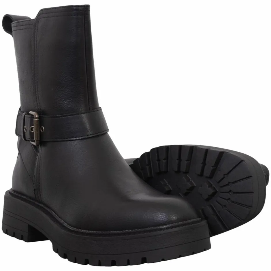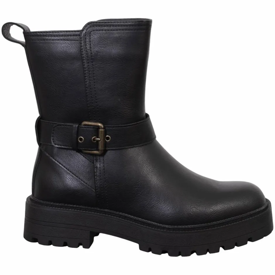 Disse sorte støvler kombinerer et biker-inspireret look med et rent, tidløst design. Mellemskaftet giver støtte omkring anklen, mens den runde snude og den kraftige sål sikrer behagelige skridt hele dagen. En dekorativ rem med spænde sætter et markant punktum og giver et stilrent twist.